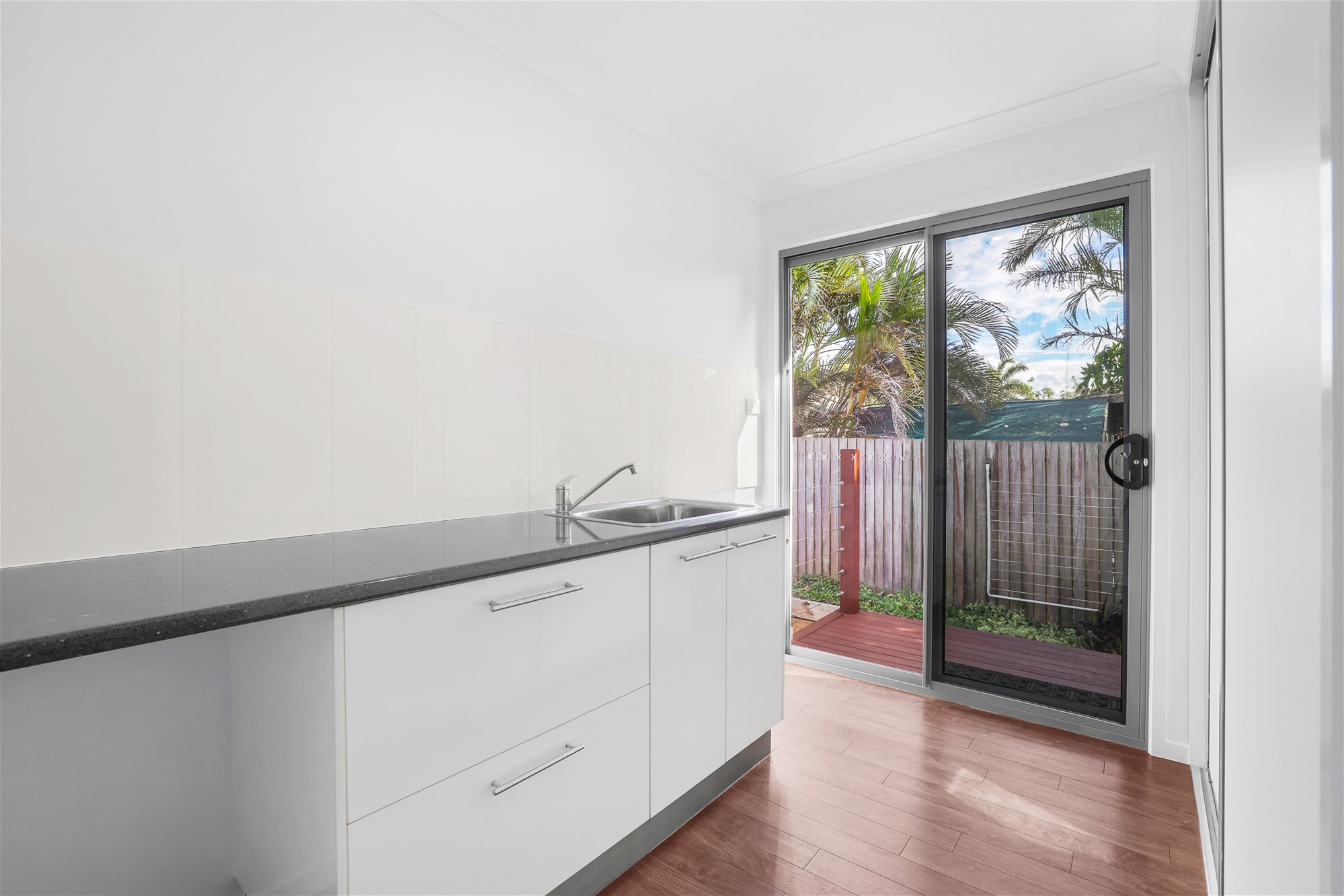 o Laundry with timber-look vinyl flooring, built-in cupboards, bench space and external access to clothesline