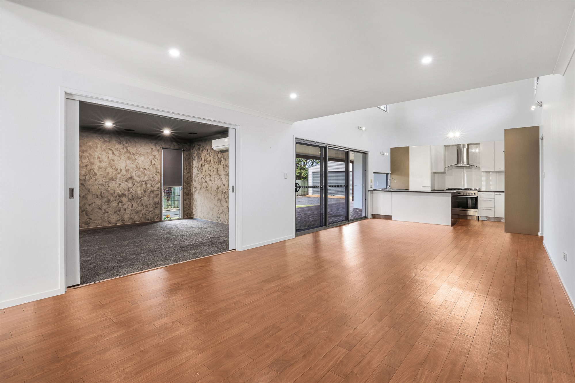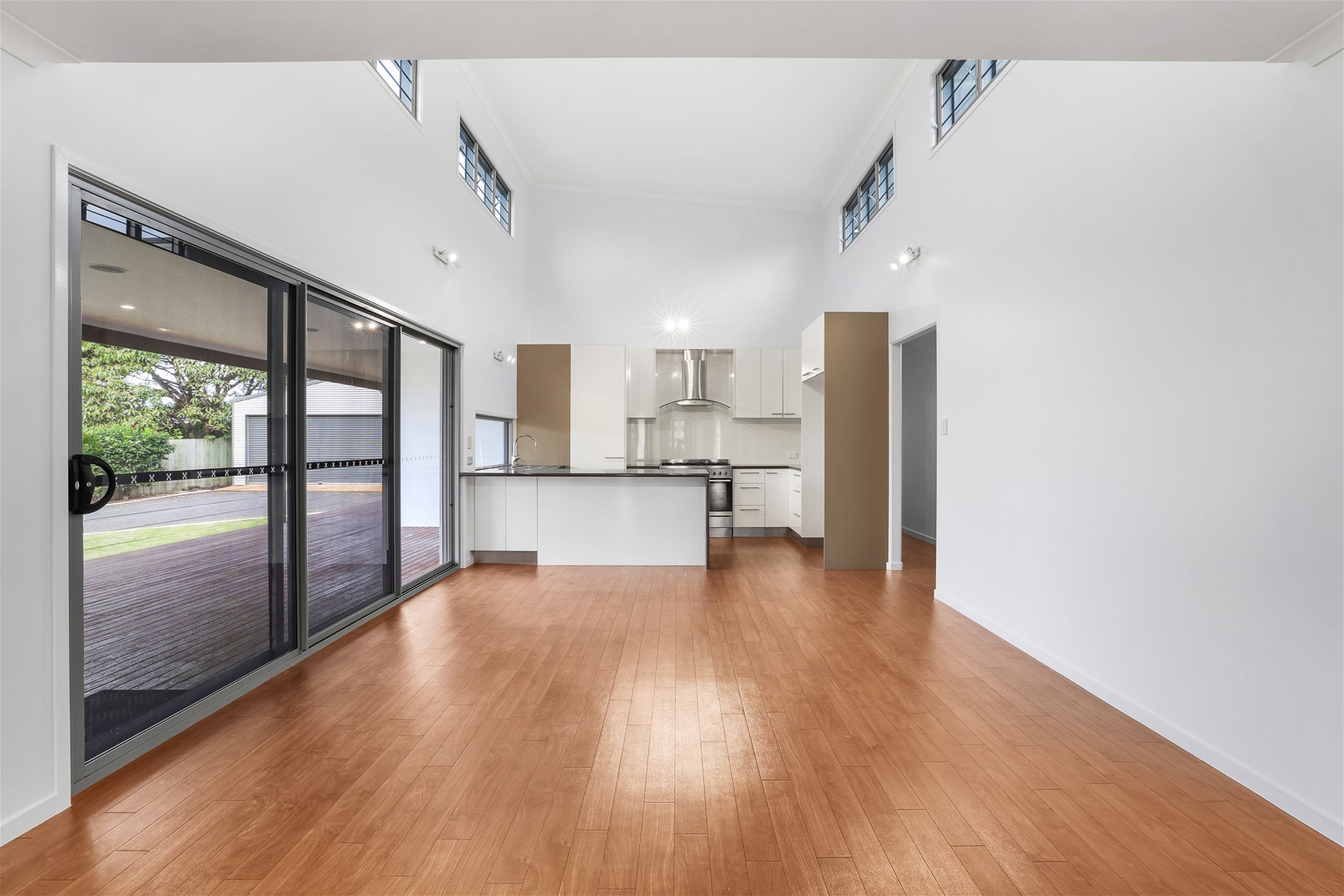 o Open plan living and dining area with timber-look vinyl flooring beneath 4.6m high skillion ceilings and clerestory windows