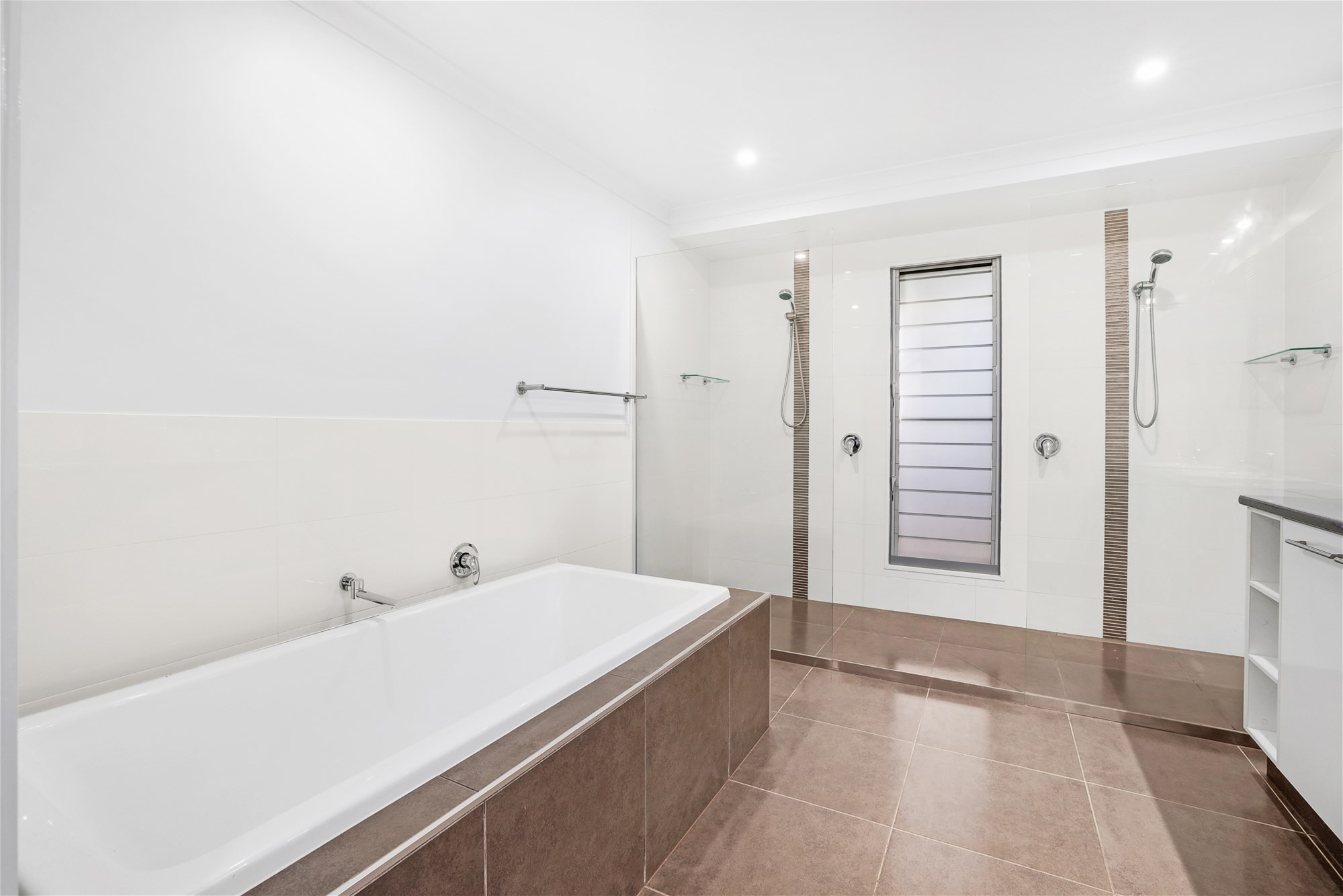o Family bathroom with bathtub, double vanity and spacious double shower