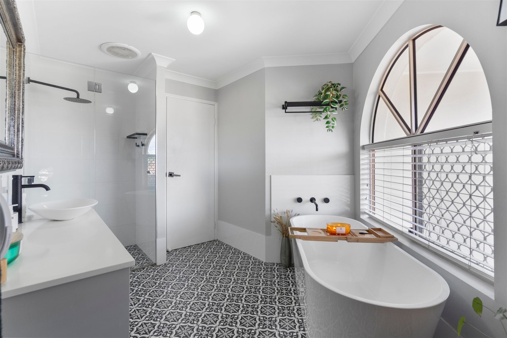 o Exquisite second bathroom with shower, feature bath, oversized arched window and toilet