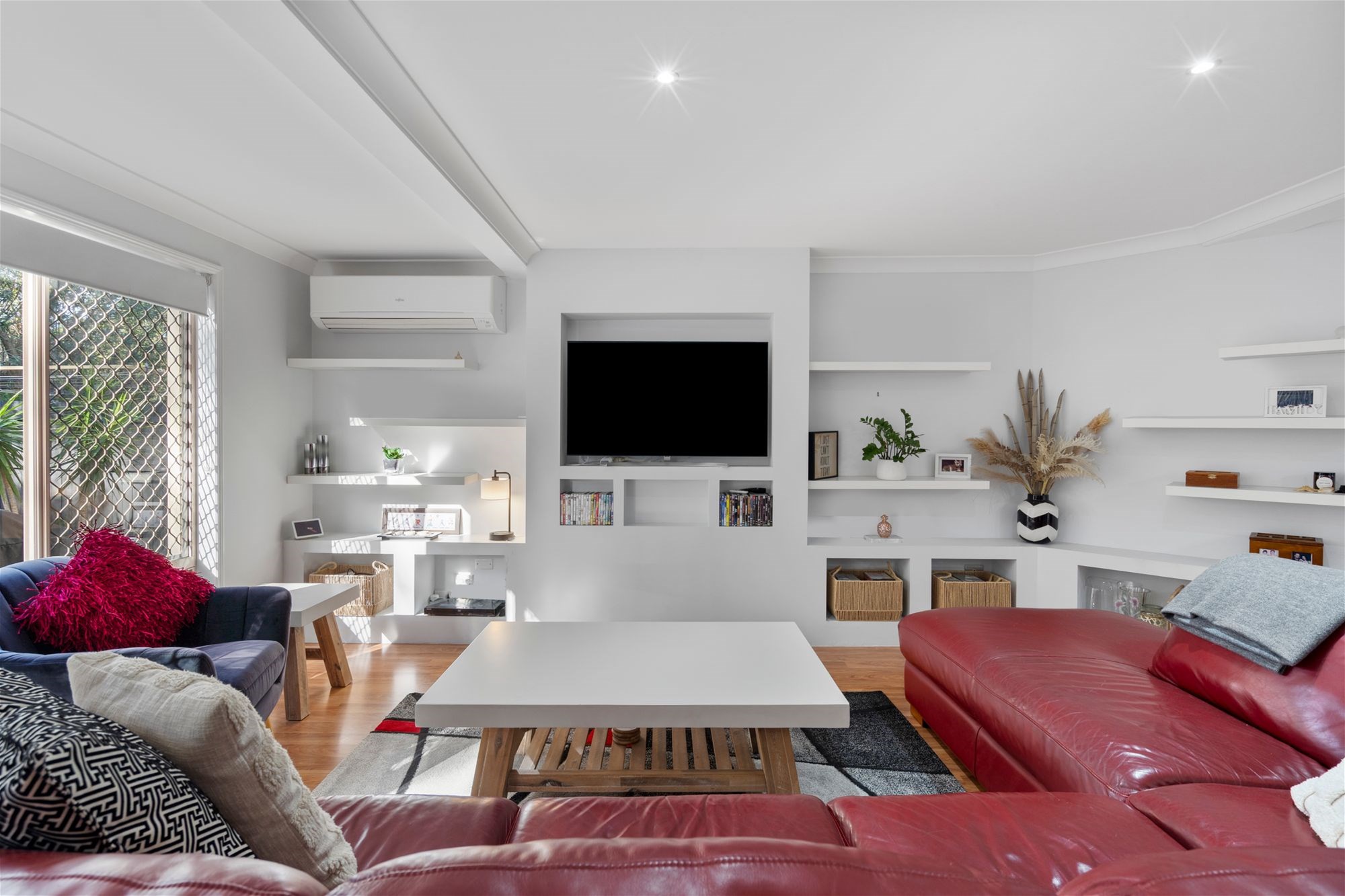 o Light-filled open plan lounge and dining area with air-conditioning, built-in shelving, ceiling fan, timber look flooring and sliding security doors to expansive outdoor terrace