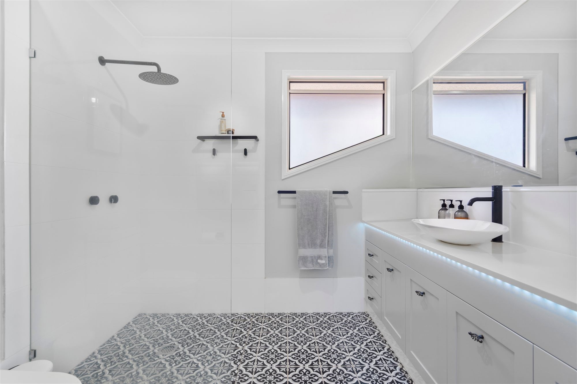 o Modern ensuite with shower, toilet and vanity with LED lighting