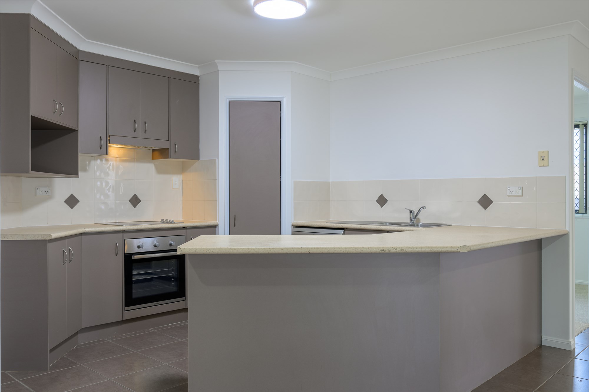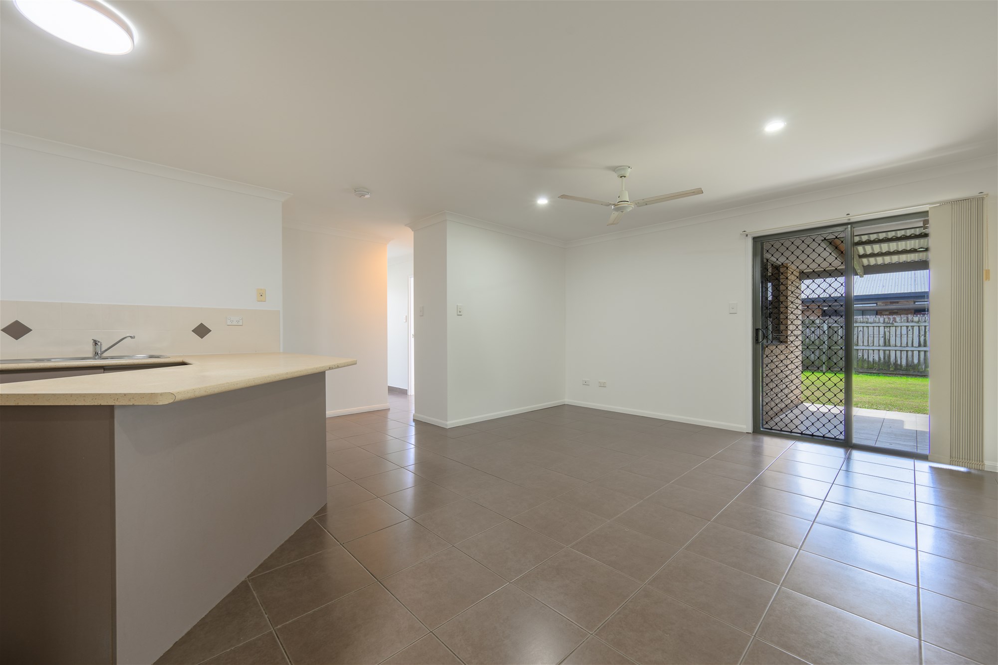 * Open plan kitchen, dining and living area with tiled flooring, split system air conditioning, ceiling fan and blinds