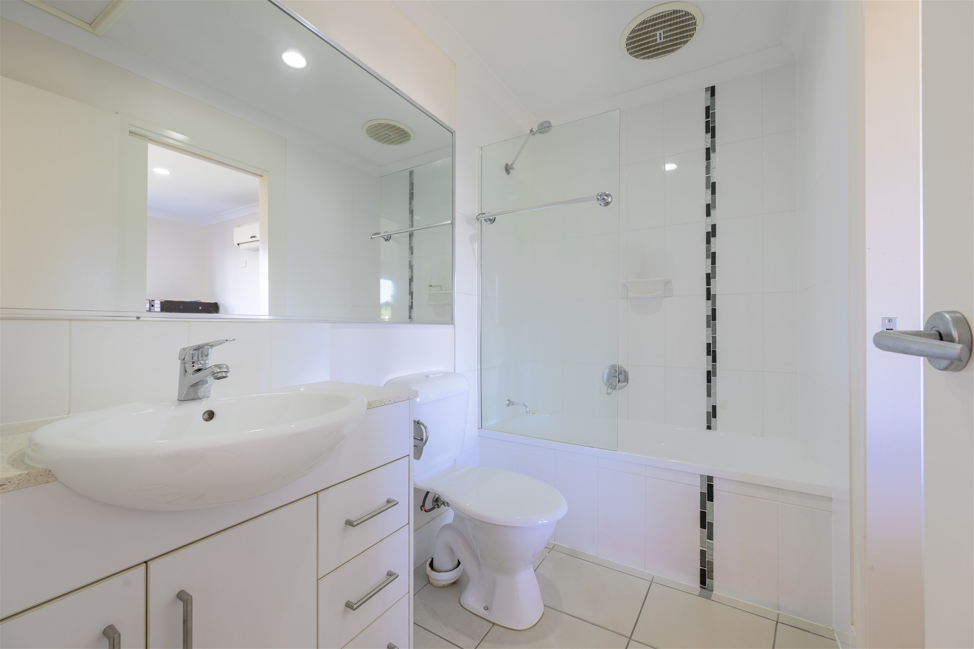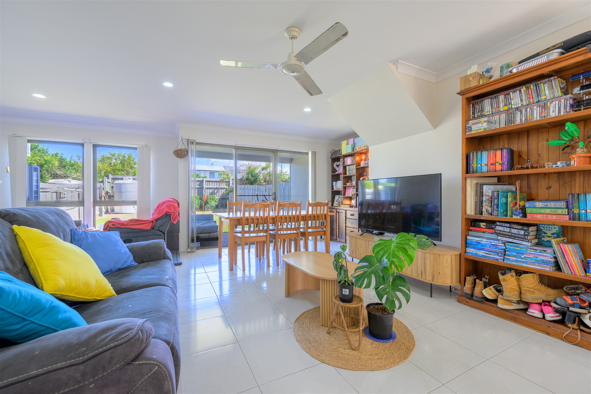 Open-plan tiled living and dining area with air-conditioning, perfect for relaxed everyday living