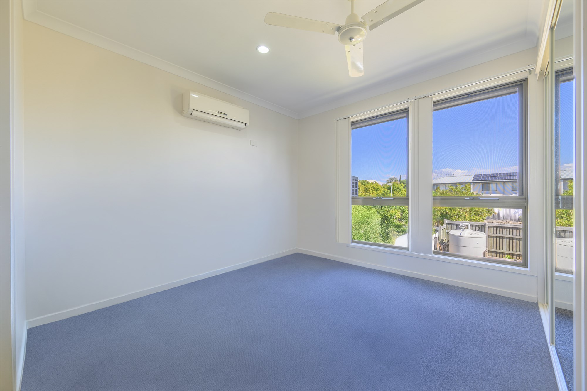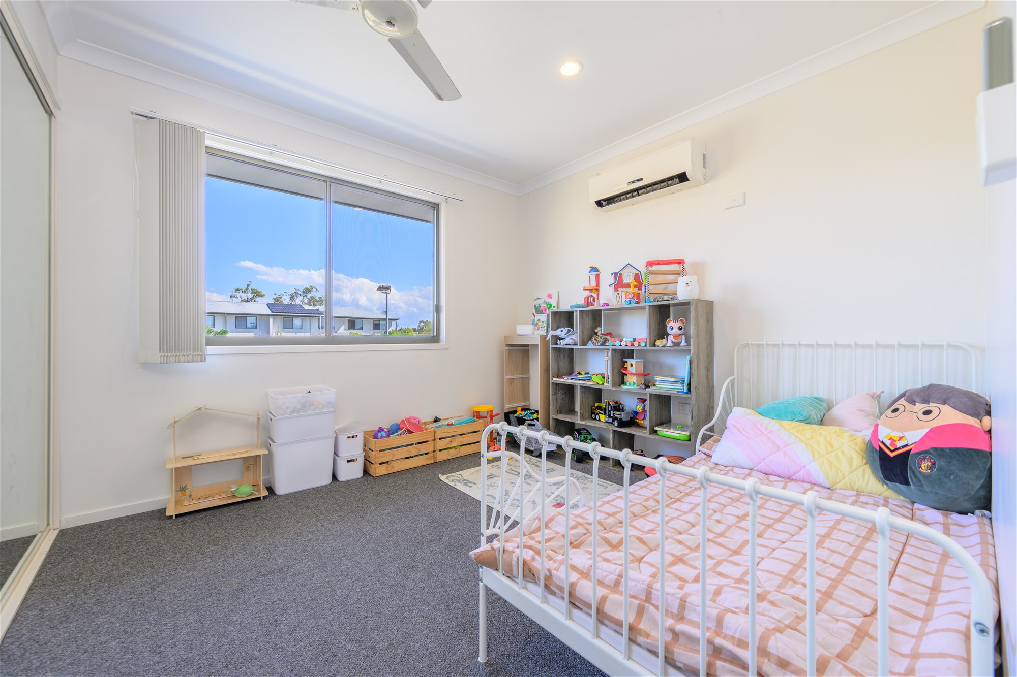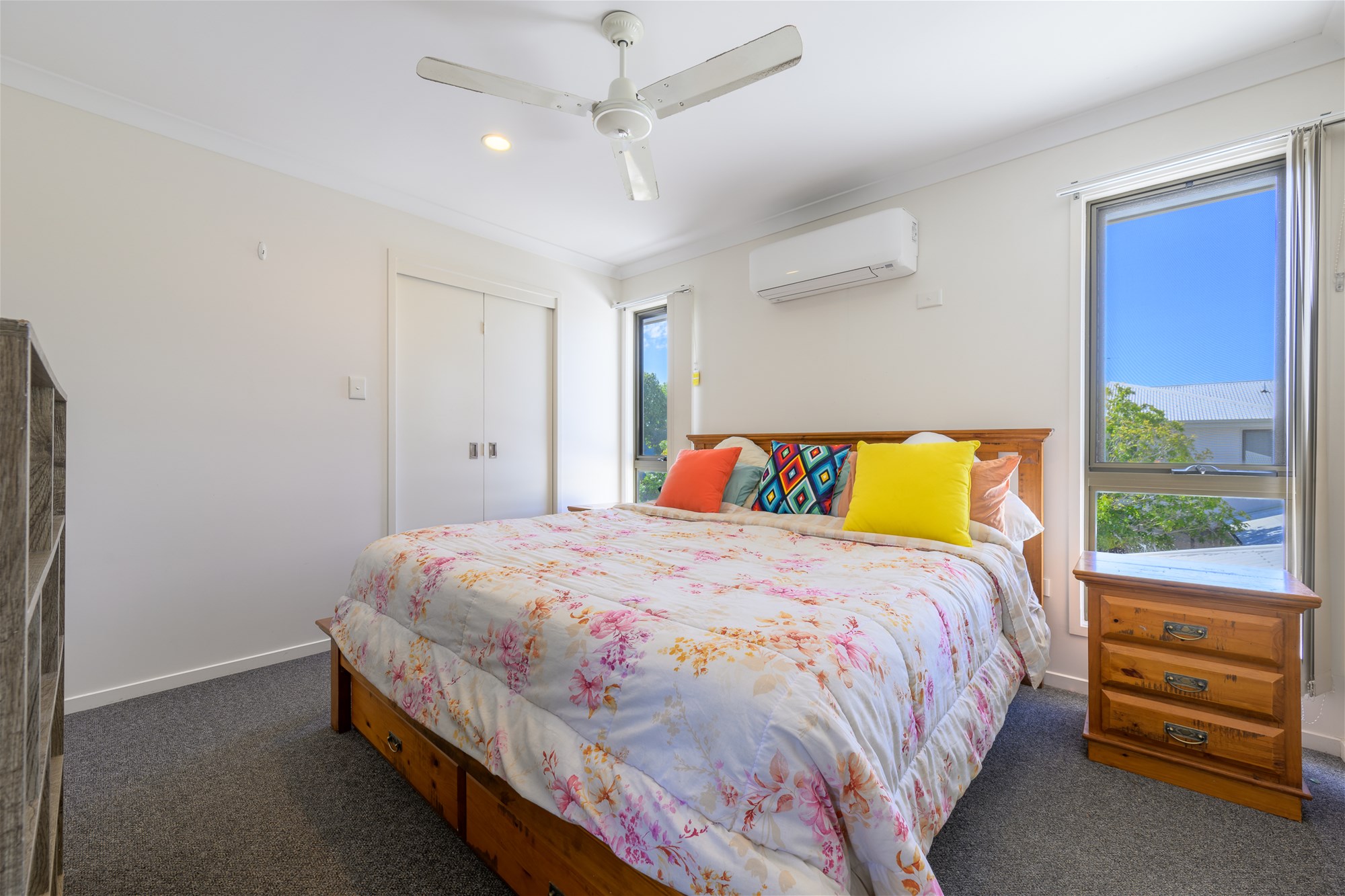 Three generously sized bedrooms with plush carpet, ceiling fans, and split-system air conditioning