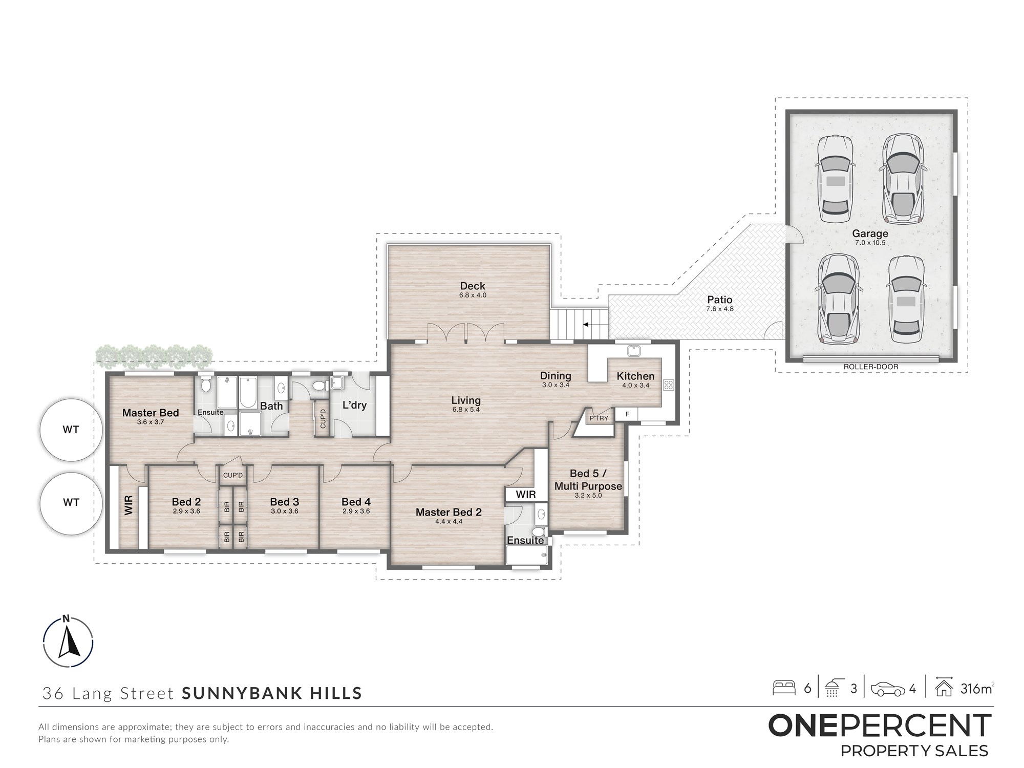 Accommodation is generous, with two master bedrooms, each with its own private ensuite, providing the perfect solution for multi-generational families, guests, or parents seeking their own retreat. Three additional bedrooms plus a versatile multipurpose room — ideal as a sixth bedroom, office, or media space — are serviced by a light-filled main bathroom, ensuring comfort and convenience for households of all sizes.