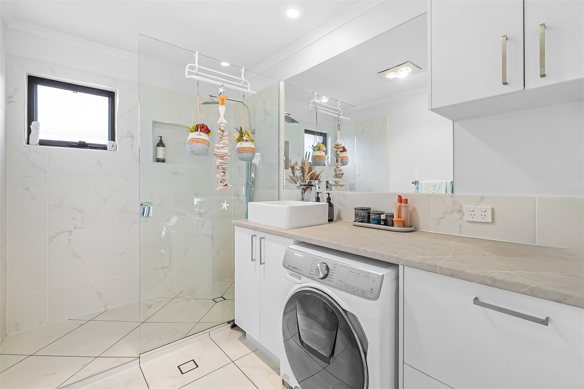– Renovated combined bathroom and laundry featuring a large, luxurious shower
