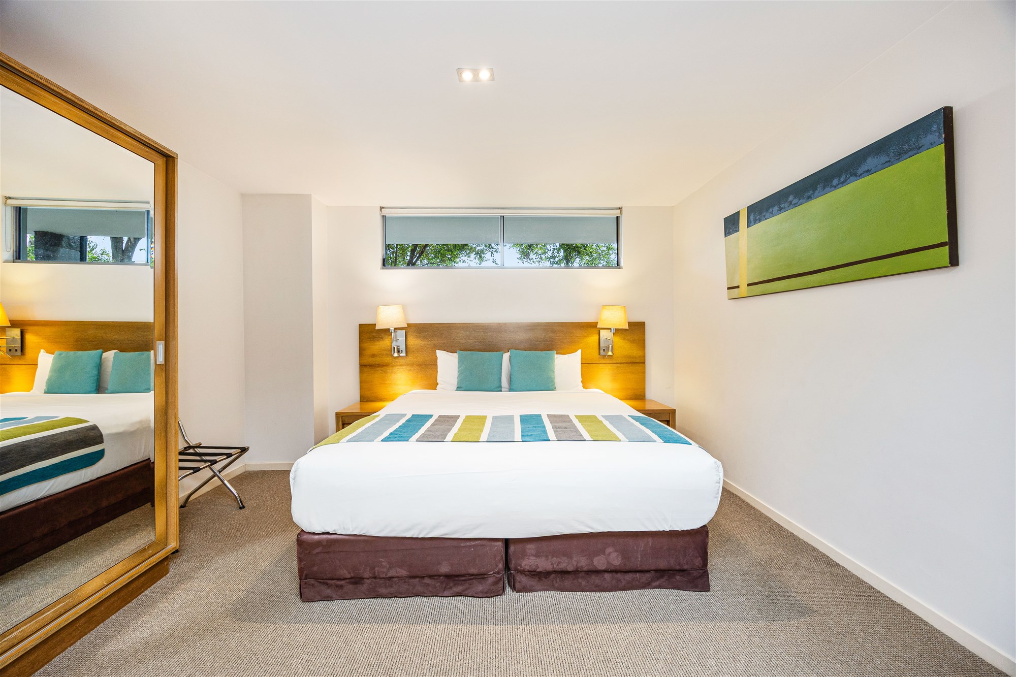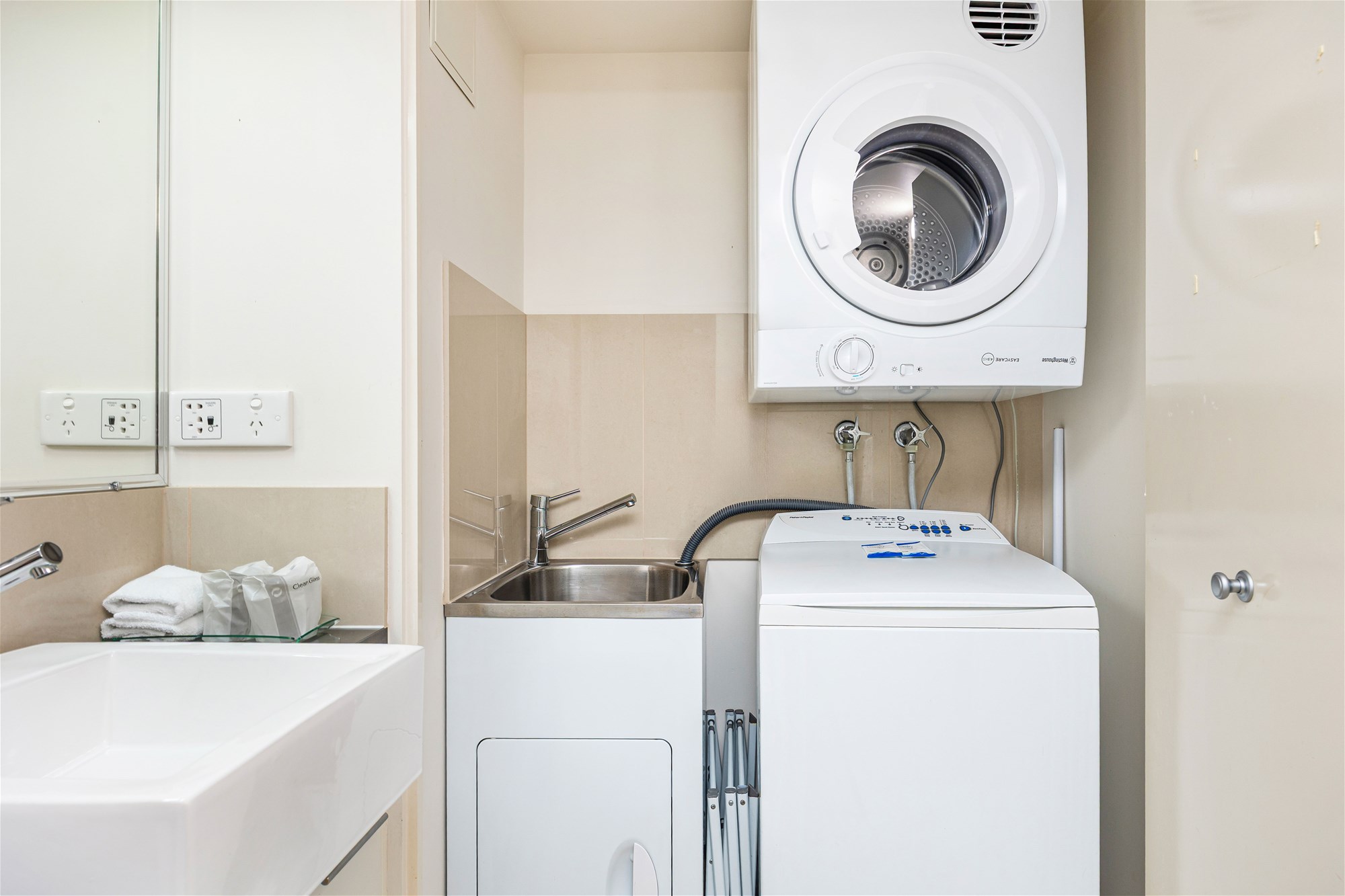 Dual-key layout – featuring a 1-bedroom apartment with a full kitchen, living area, bathroom, laundry & balcony, plus a studio-style hotel room with ensuite and private balcony.