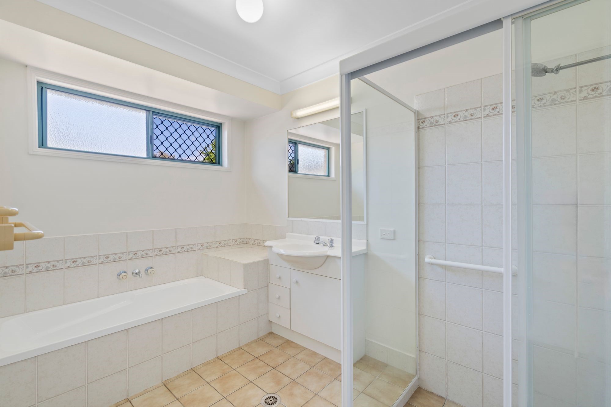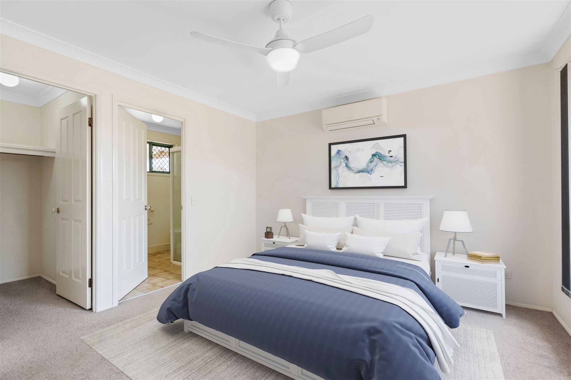 The master bedroom includes an ensuite, walk-in robe, air-conditioning, and ceiling fan, while the two additional bedrooms both feature built-ins, fans, and A/C. The main bathroom includes a bath, shower, and separate toilet for convenience.