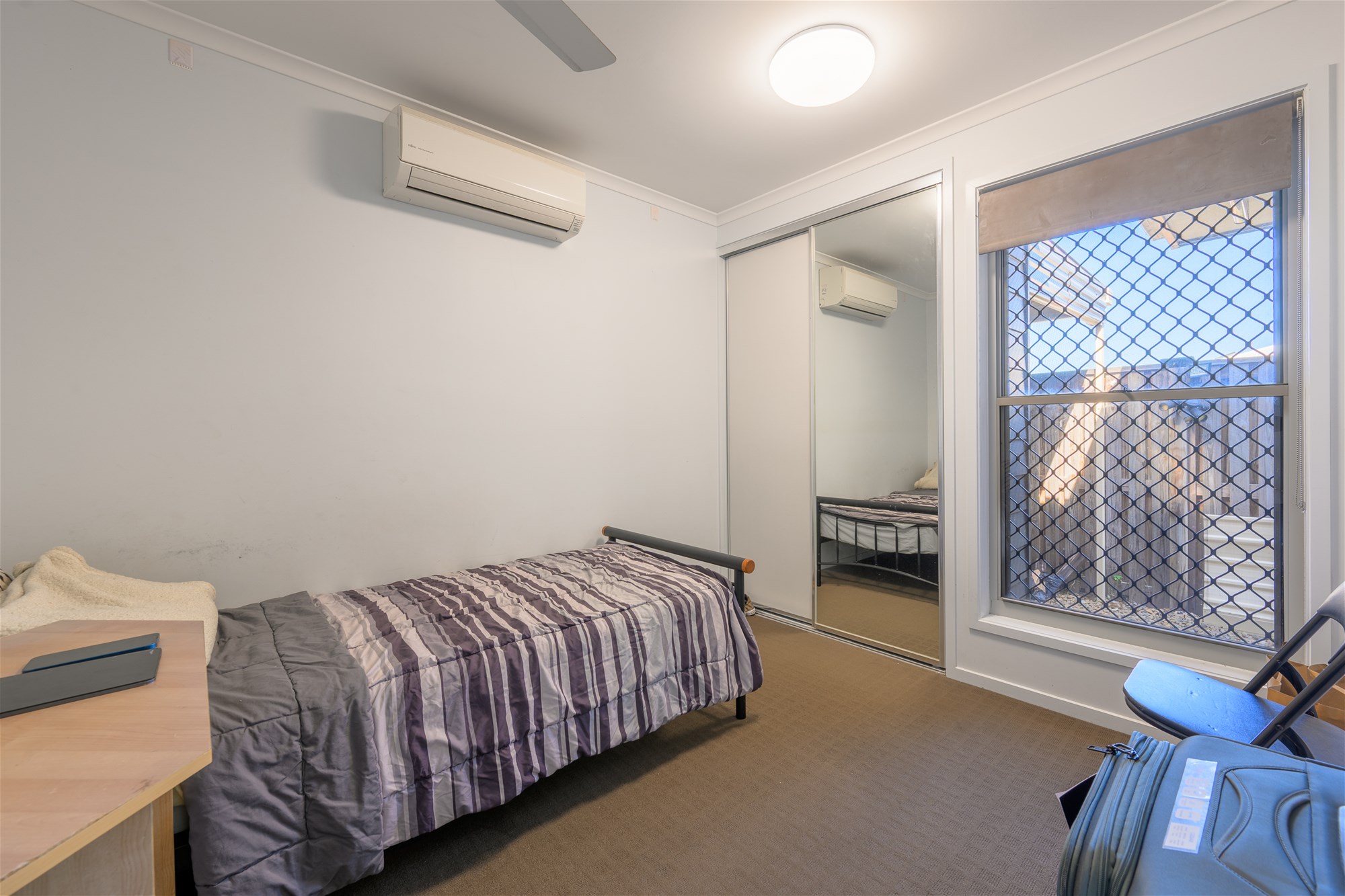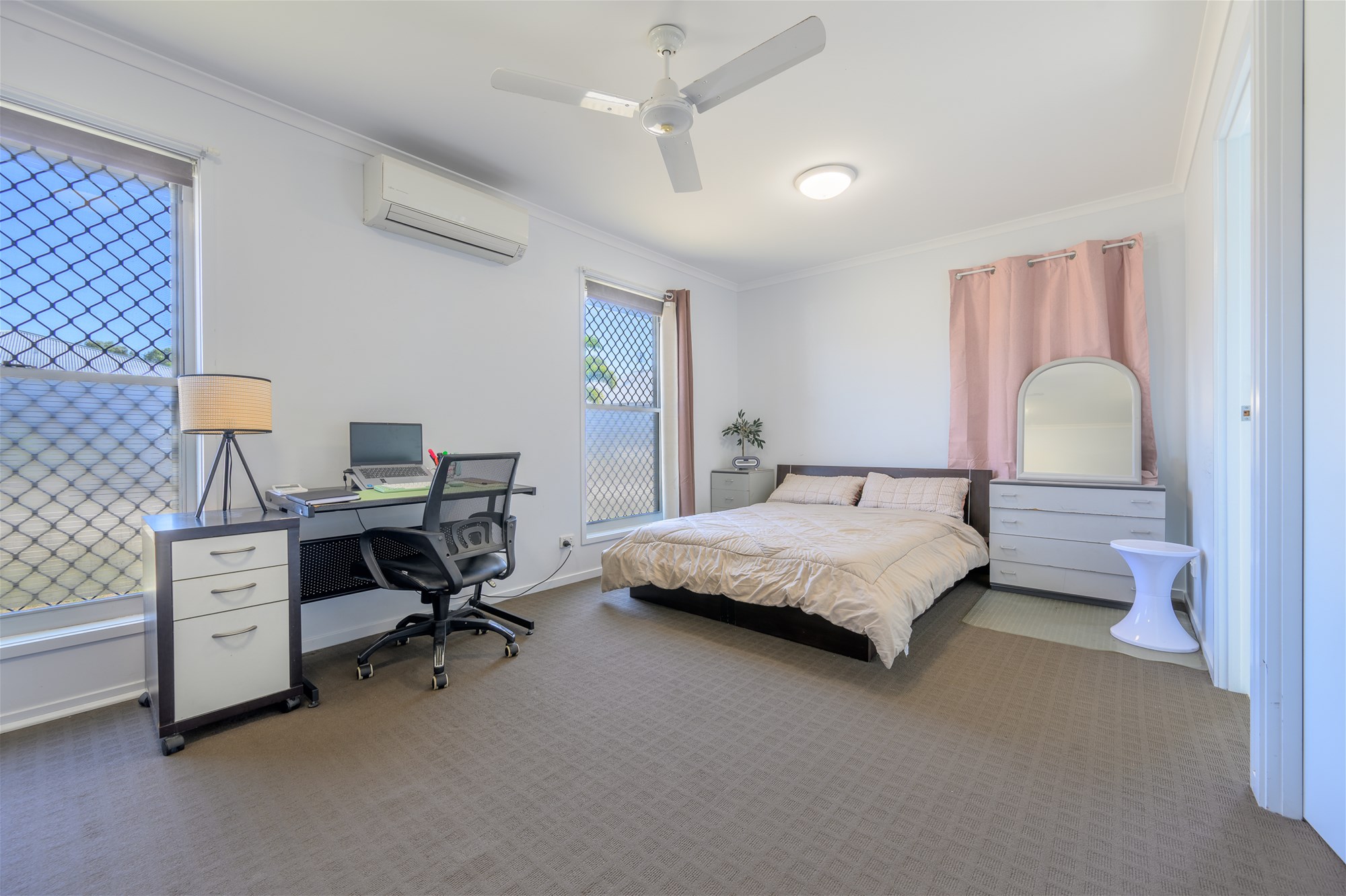 * Spacious master bedroom showcasing air conditioning, a ceiling fan, generous natural light and plenty of room for a desk or reading nook; also includes a walk-in robe.