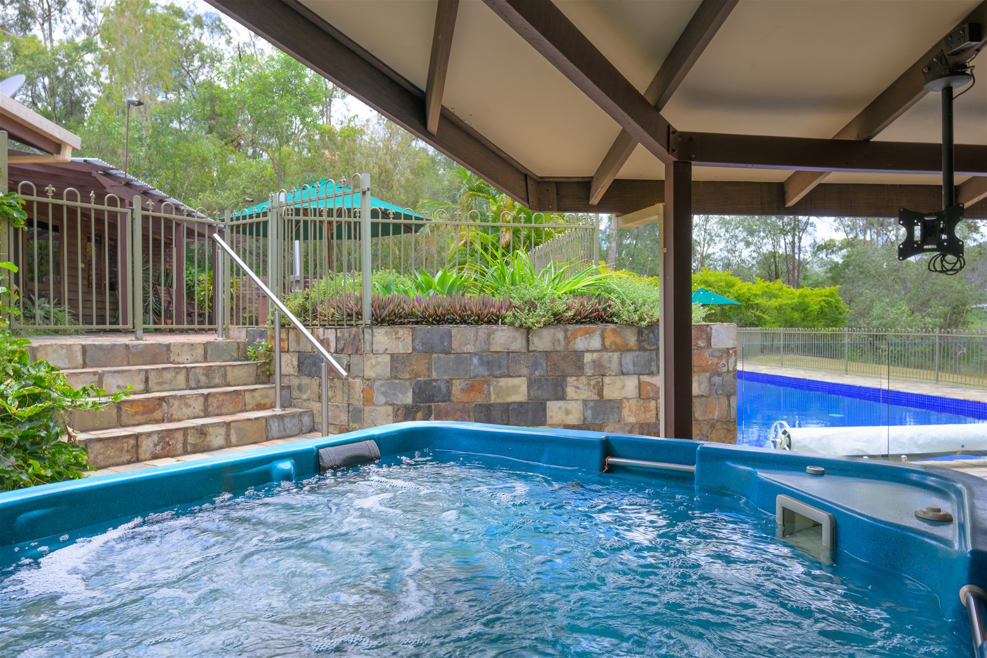 Designed for year-round enjoyment, the outdoor living is nothing short of spectacular. Multiple alfresco zones include a paved courtyard with built in BBQ and wood-fired pizza oven, perfect for hosting gatherings of any scale. The centrepiece is a 17 meter solar-heated swimming pool with slide, complemented by a separate outdoor spa, creating a private resort experience within your own grounds.
