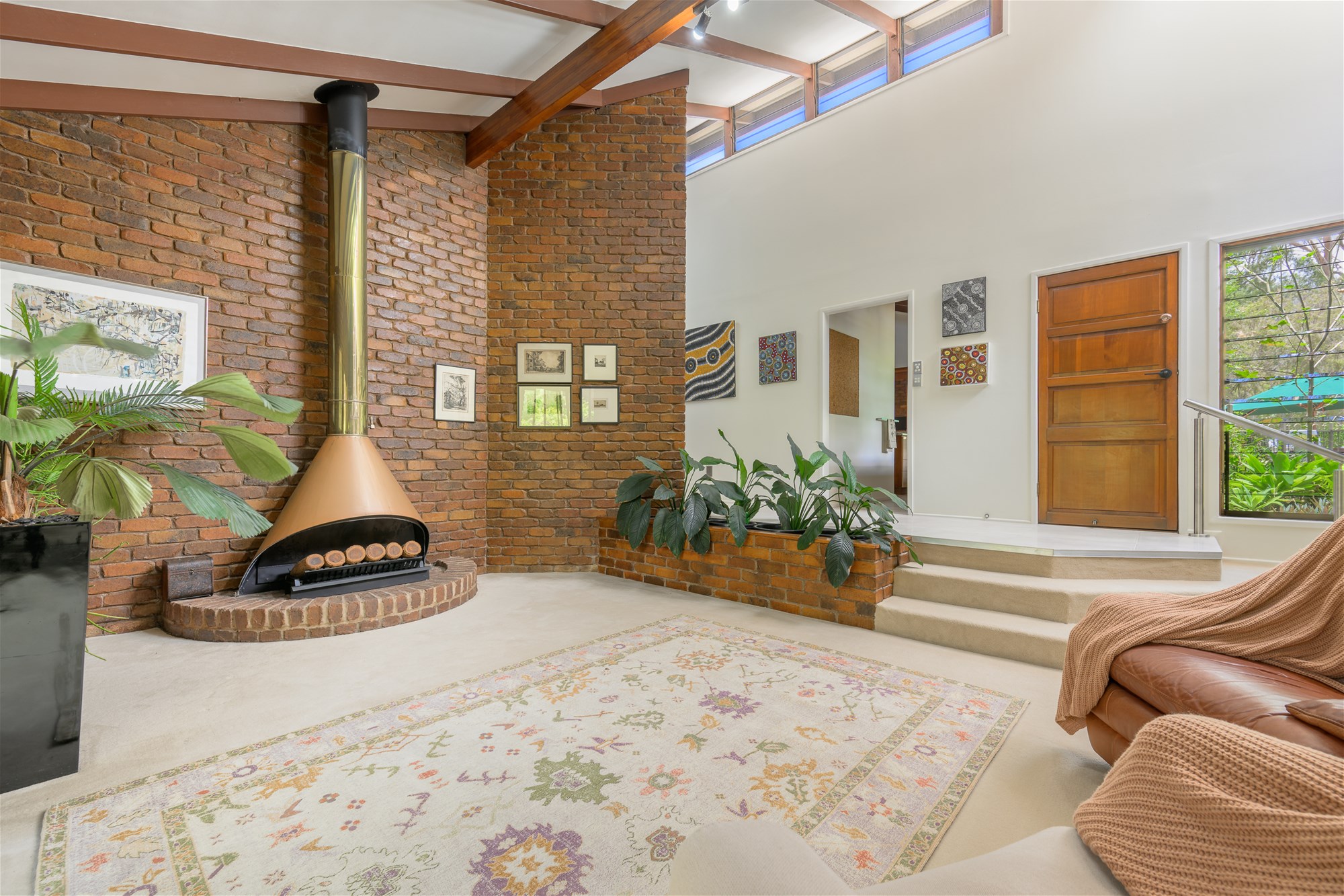 A grand entry announces the home’s scale and sophistication, leading to a beautifully proportioned interior defined by soaring raked ceilings, feature brickwork, highset louvres and warm timber accents throughout. The split-level residence unfolds across an expansive and highly functional floor plan.