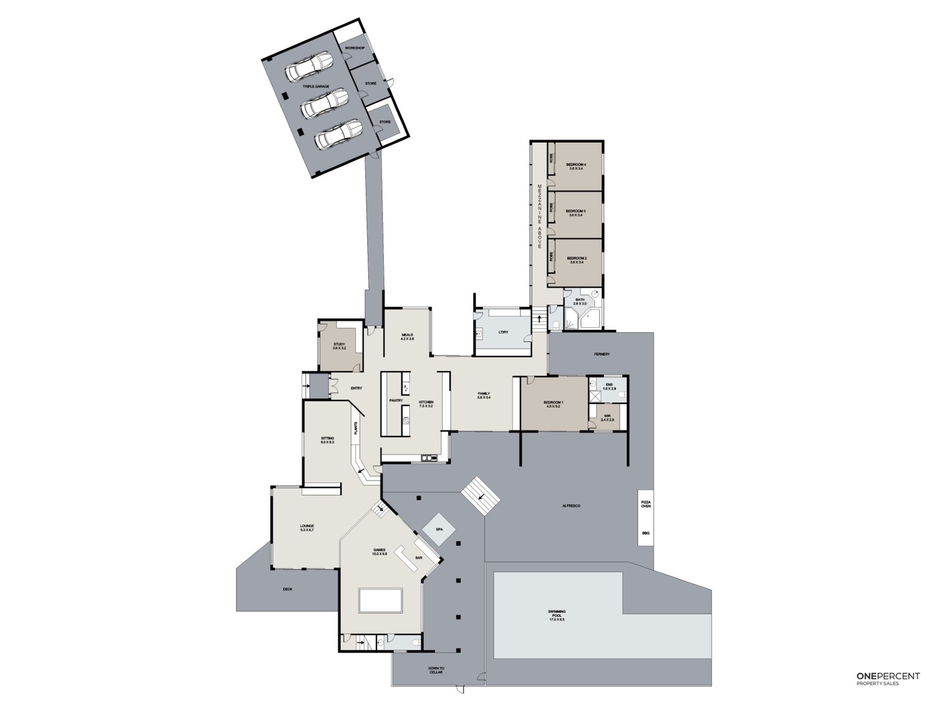 · 3 car brick garage with auto roller doors, 3 storage rooms and mezzanine storage area