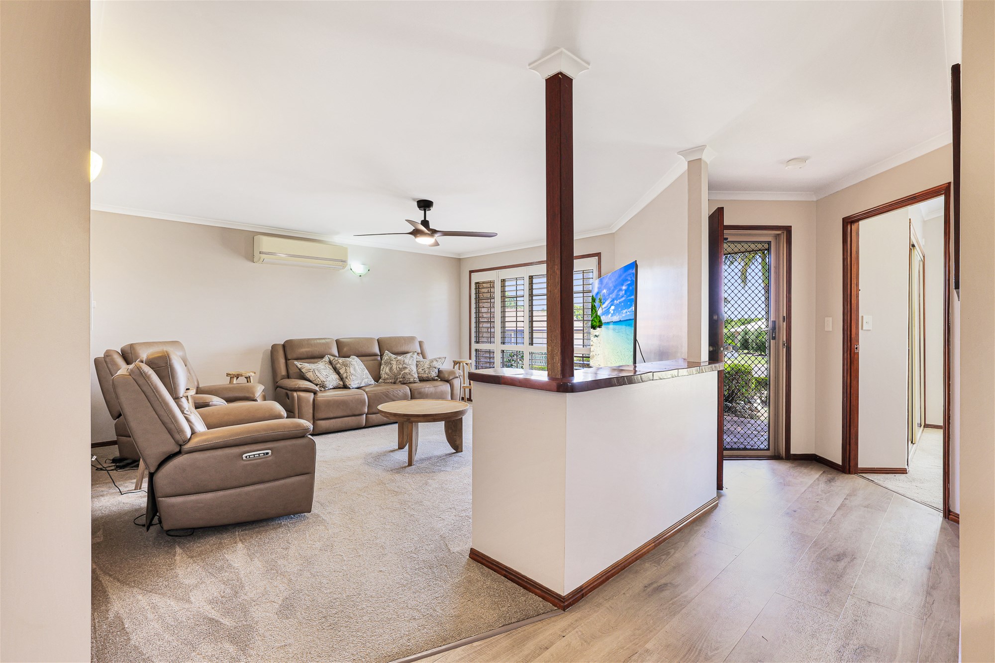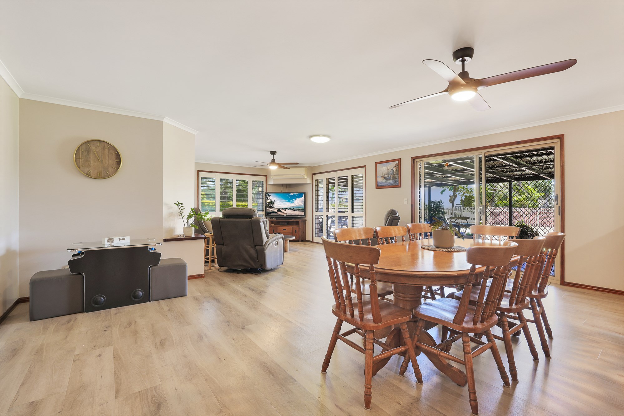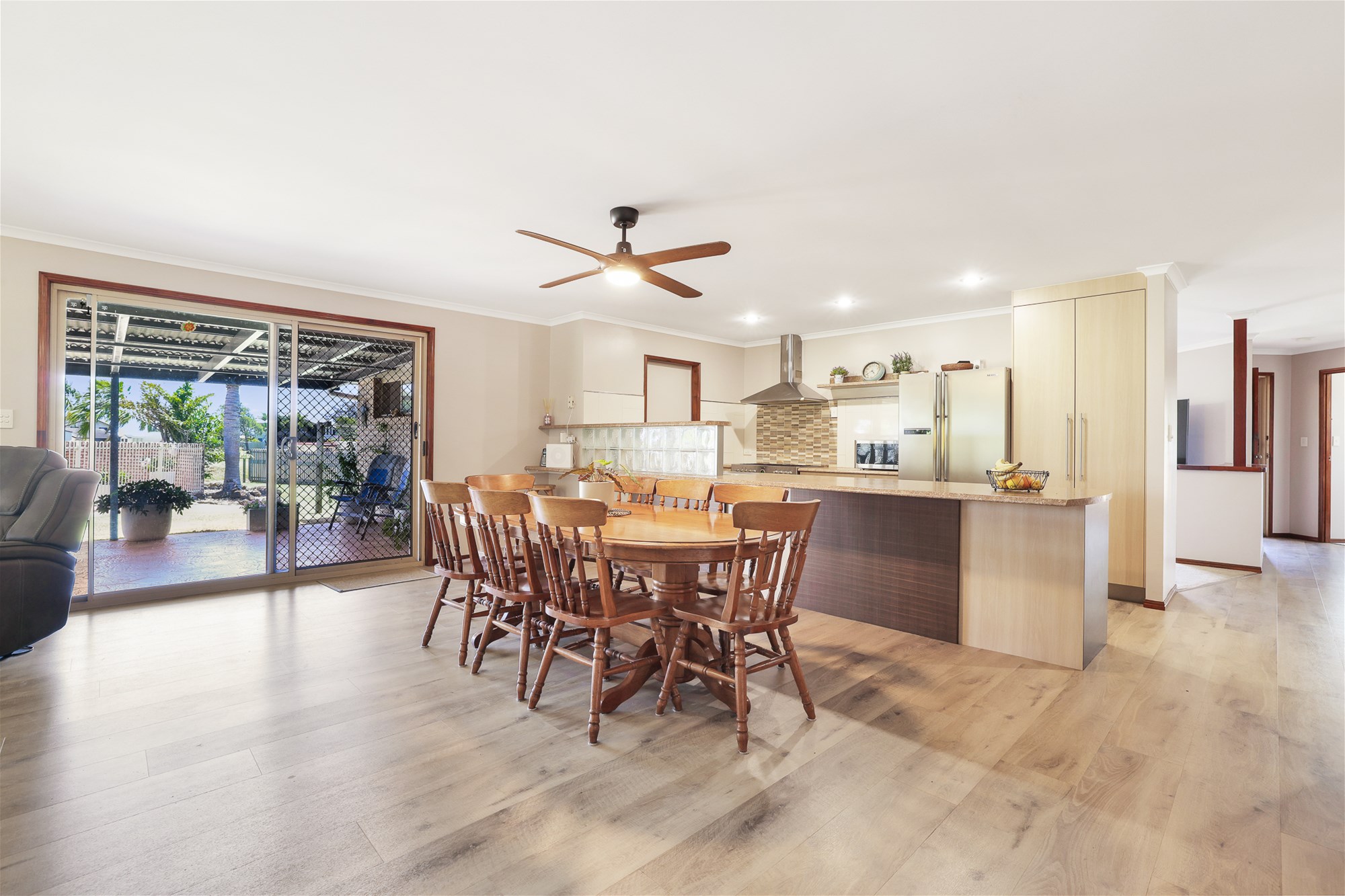 o Spacious open plan lounge and dining area with air-conditioning, ceiling fan, contemporary timber-look vinyl flooring and large sliding doors to outdoor alfresco area