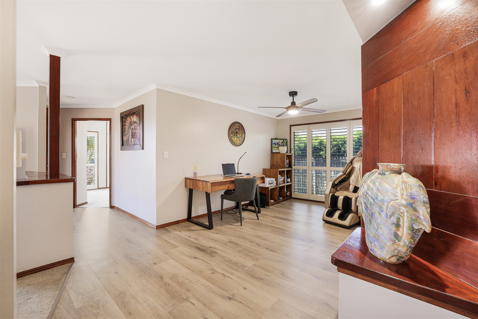 o Separate generously sized lounge space with ceiling fan, plush modern carpet