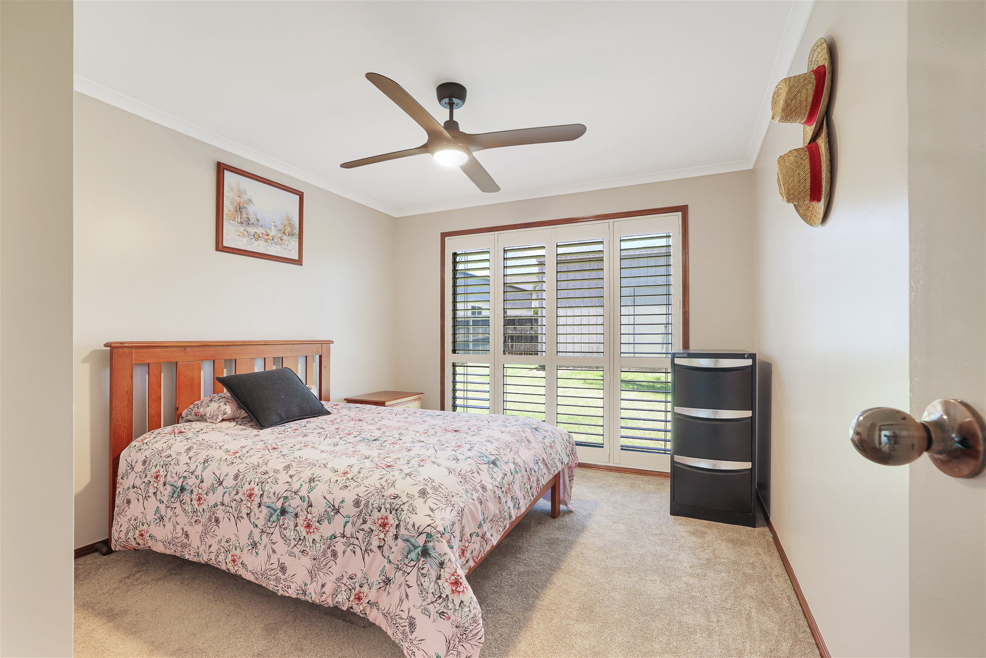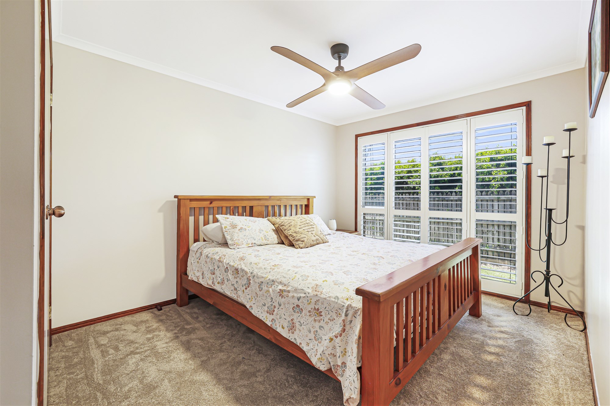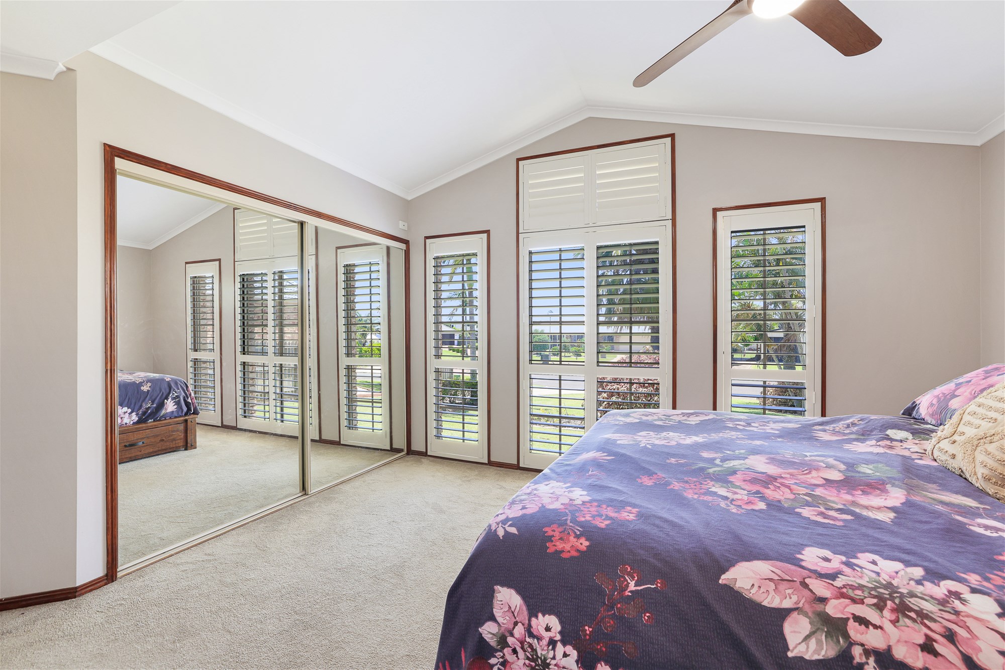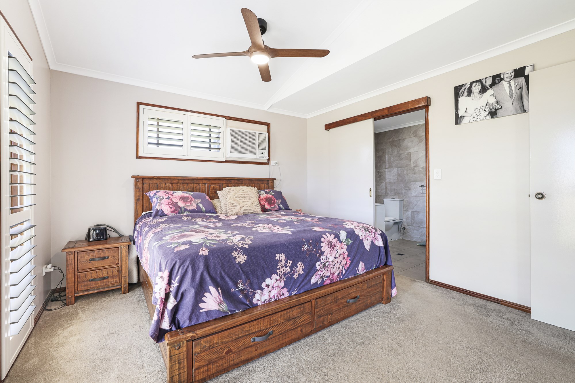 o Master bedroom with ceiling fan, air conditioning, large built in wardrobe, modern carpet and large windows dressed with shutters for privacy
