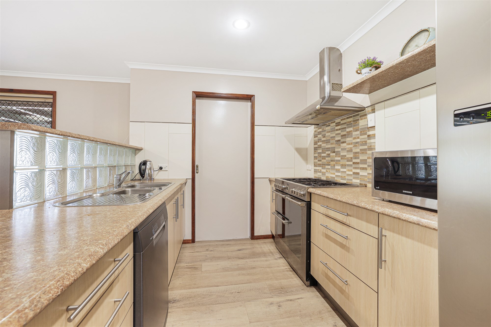 o Stylish kitchen featuring ample bench space, an abundance of storage, gas cooktop, electric 3-deck oven and BOSCH dishwasher