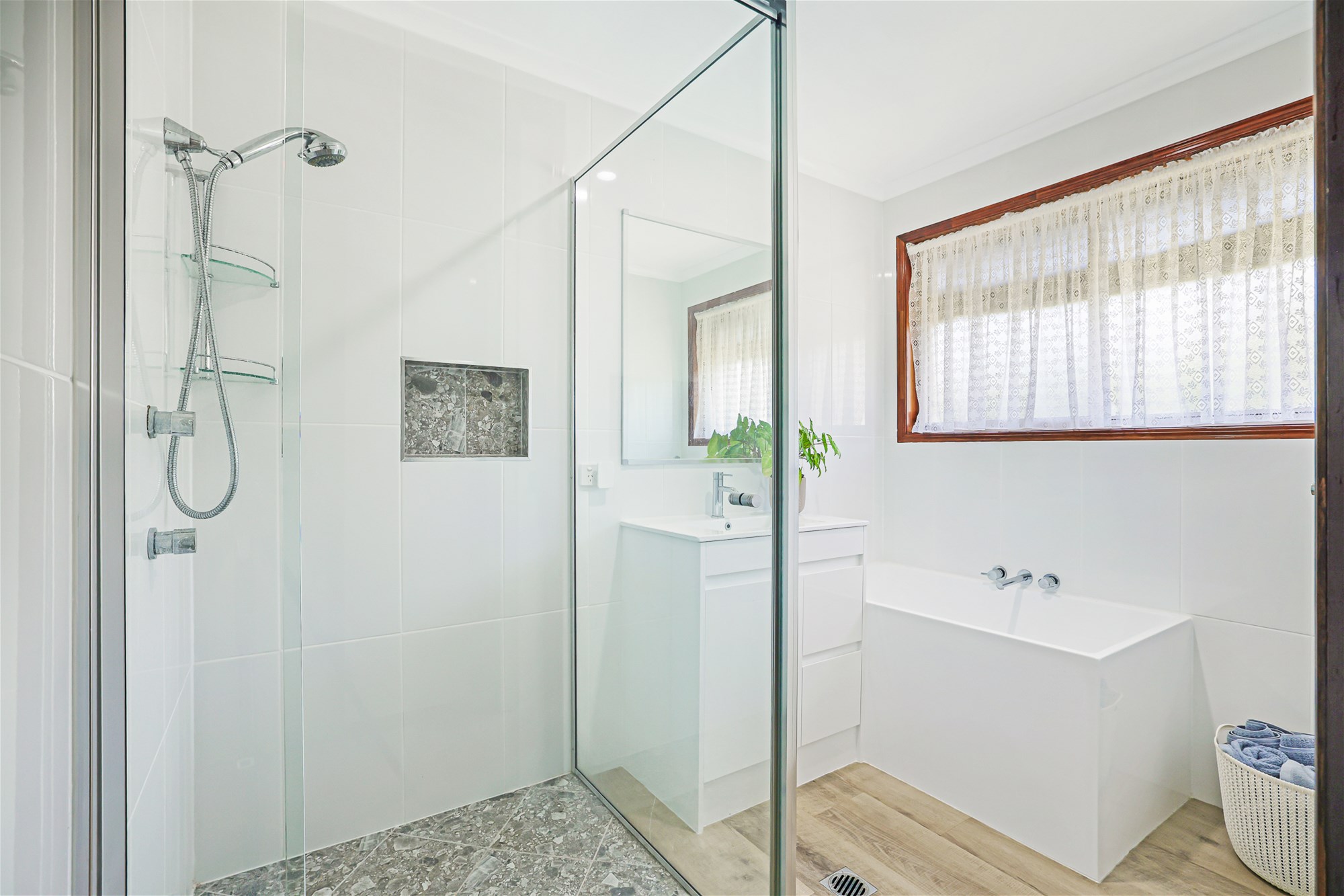 o Recently renovated family bathroom featuring a modern vanity, bath tub, floor-to-ceiling tiled shower and separate toilet.