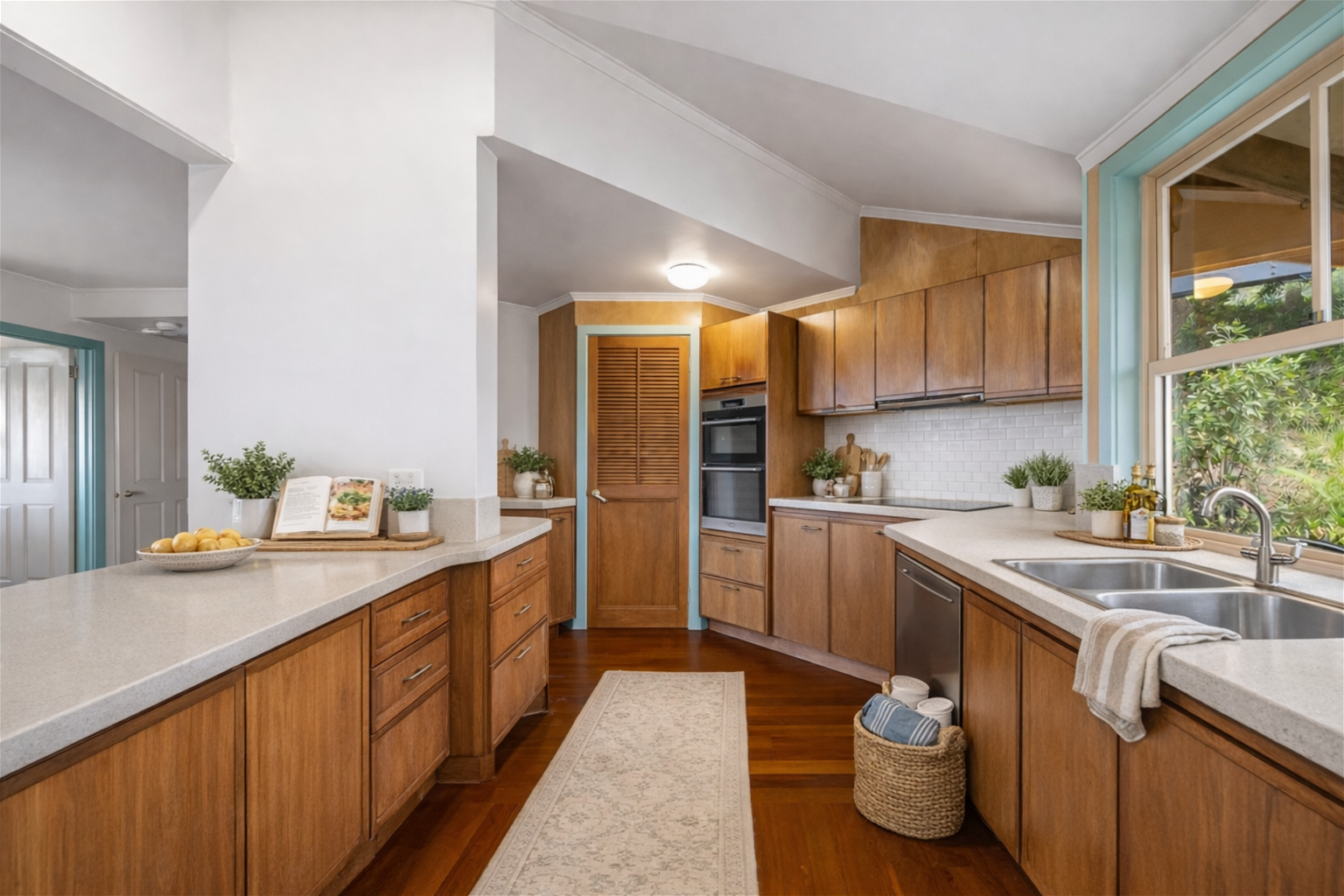 Defined by clean architectural lines, warm timber textures and expansive glazing, the home seamlessly integrates with its natural surrounds. Designed to embrace its hillside setting, it maximises cooling breezes, natural cross-ventilation and beautiful outlooks from sunrise to sunset.