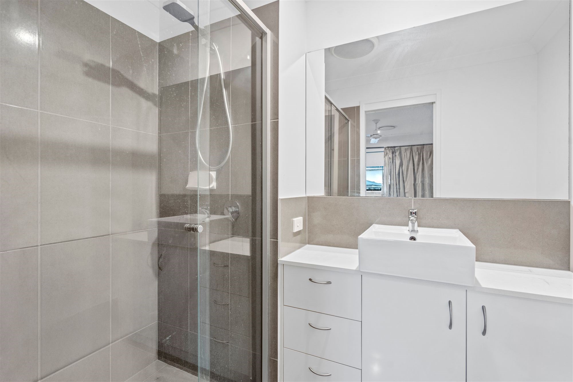 The upper level is the home’s quiet retreat, comprising the master bedroom with ensuite, a second bedroom, and the main bathroom with bath and shower. All bedrooms feature built-in wardrobes and ceiling fans, ensuring comfort and practicality throughout.