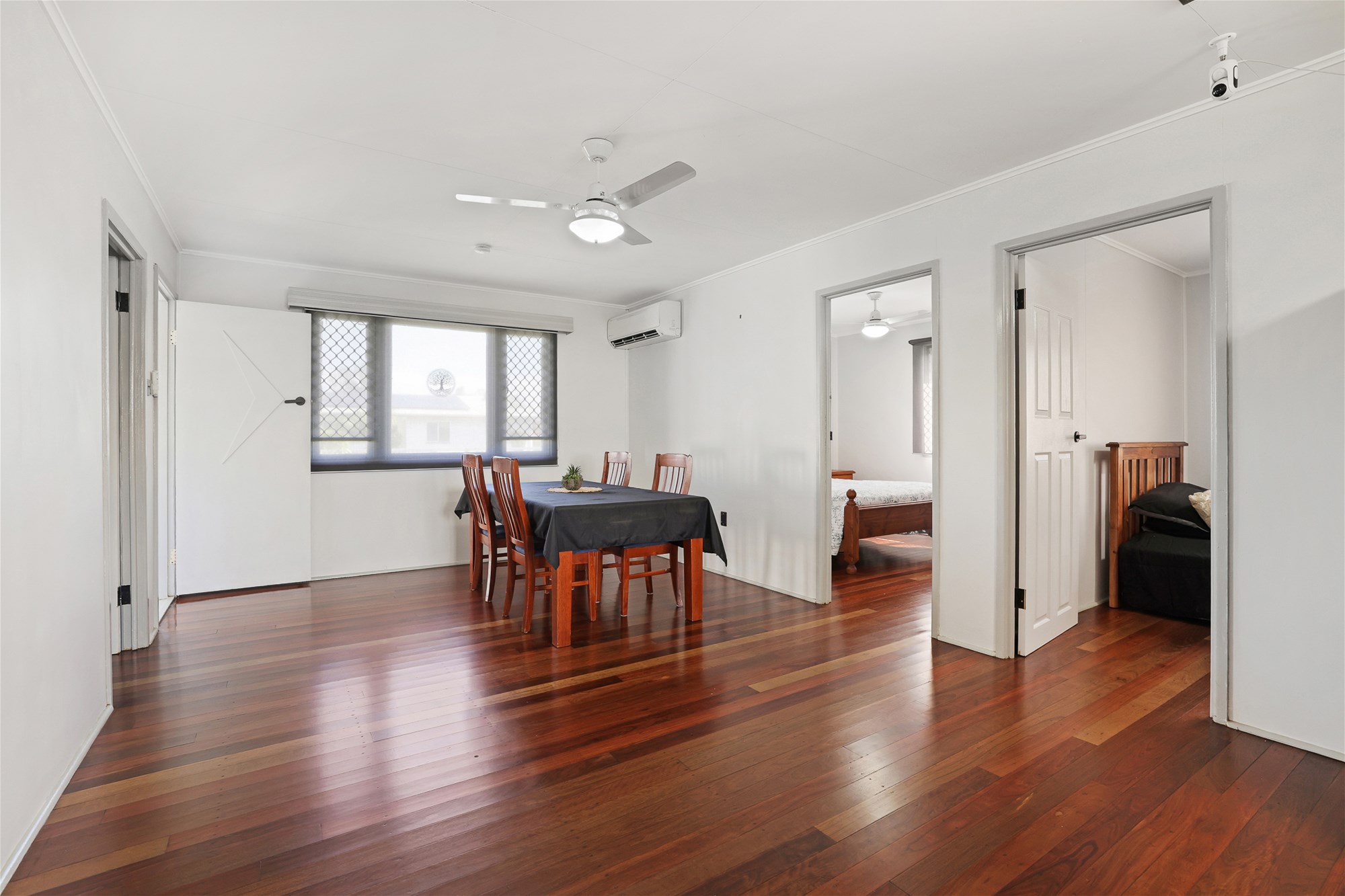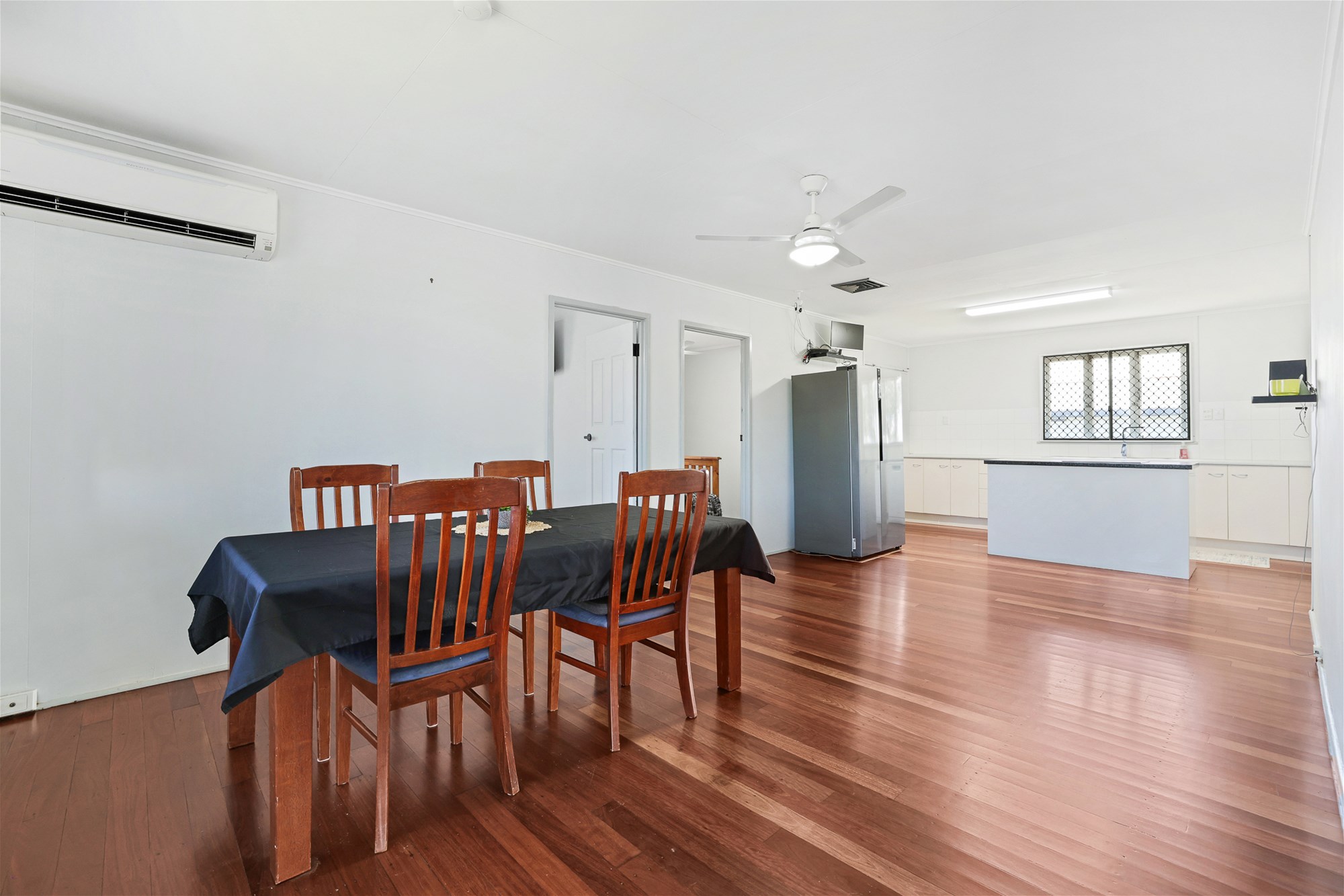 o Open-plan living/dining area, featuring air conditioning, a ceiling fan, polished timber flooring
