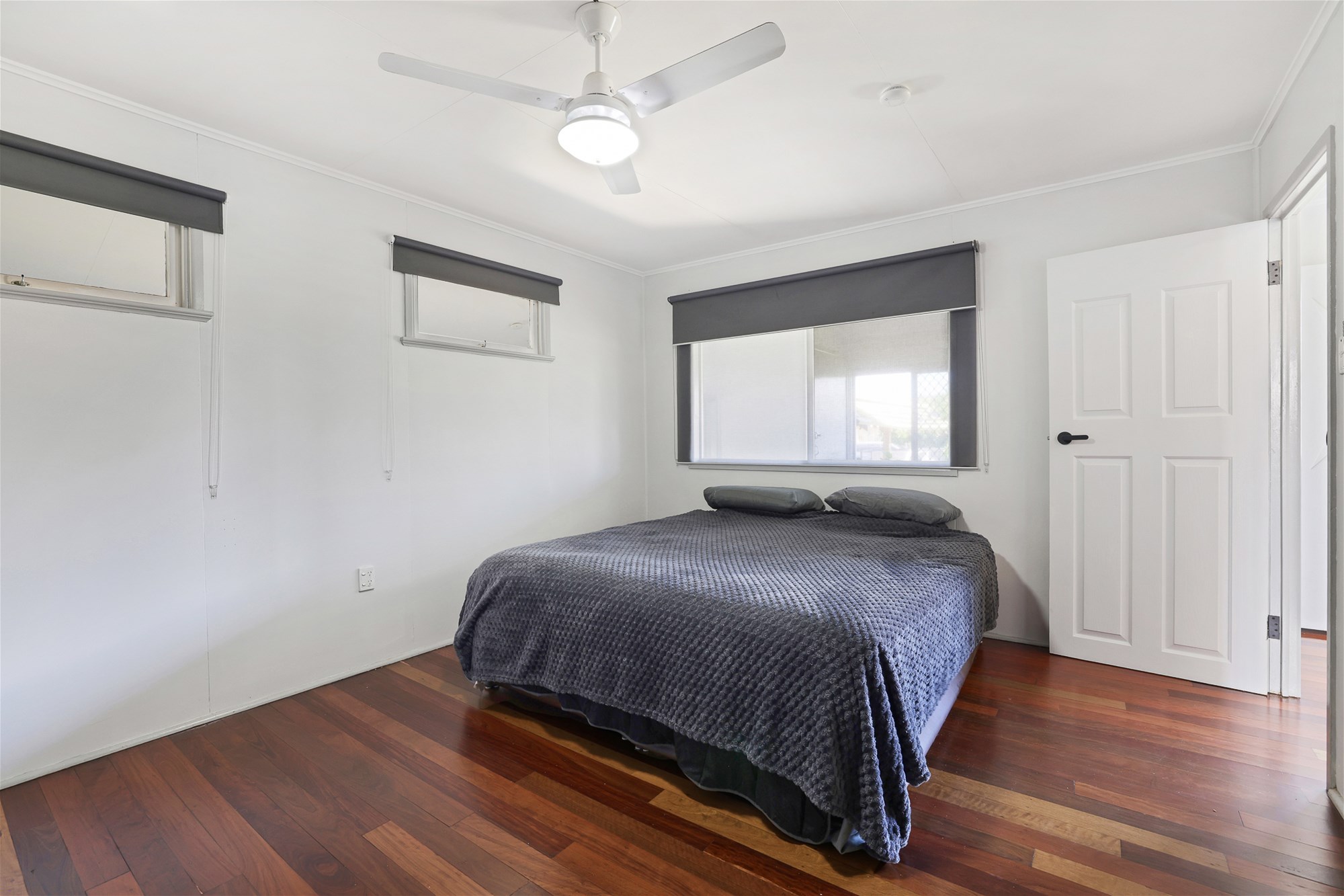 o Master bedroom with ceiling fan, generously sized built-in wardrobes, and polished timber flooring