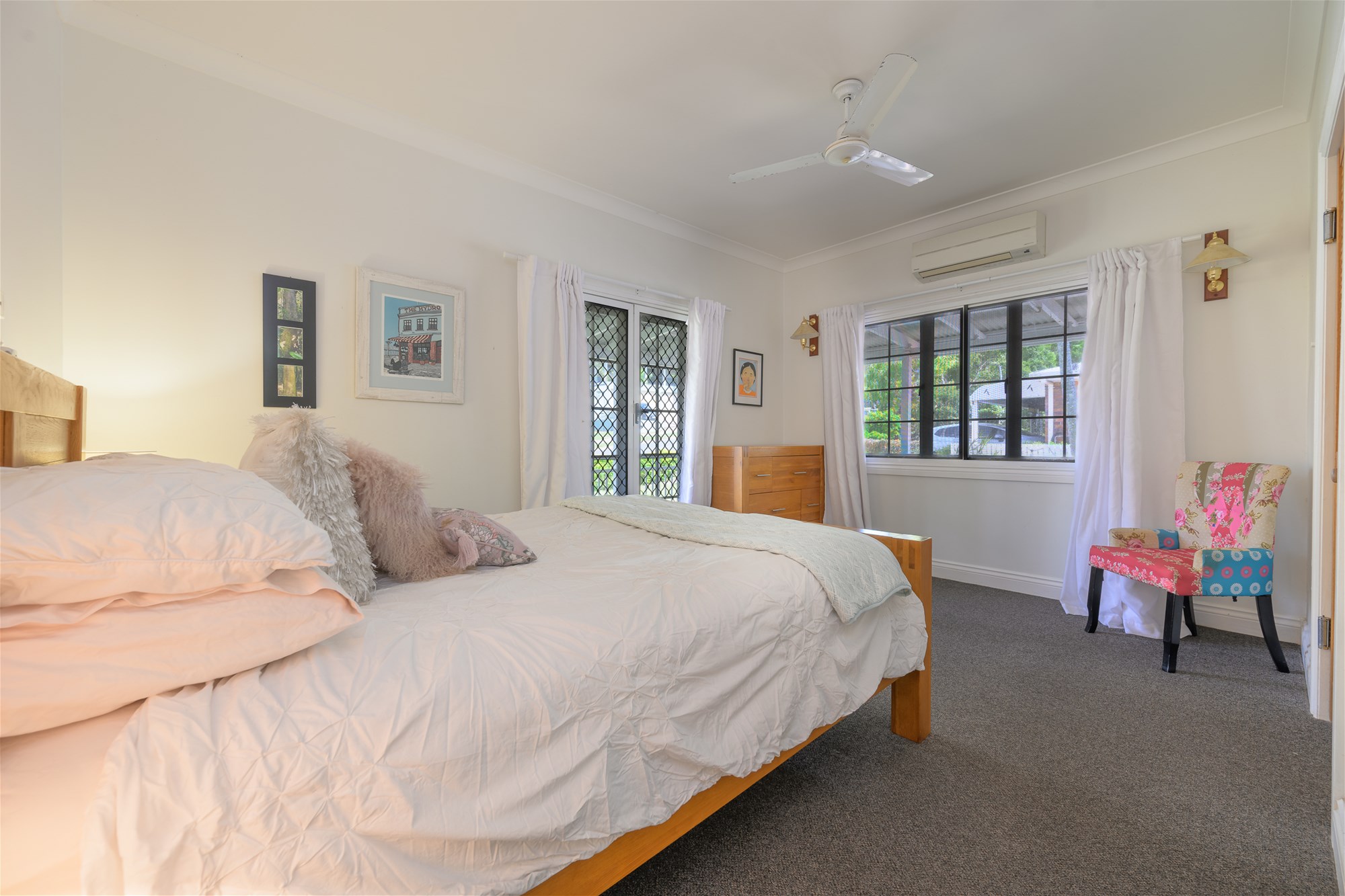 The bathroom exudes character with its warm timber paneling, beautiful stained glass windows that flood the space with colourful natural light, and a standout freestanding bath that adds both charm and relaxation. Large windows provide excellent natural ventilation, enhancing the breezy Queenslander lifestyle year round.