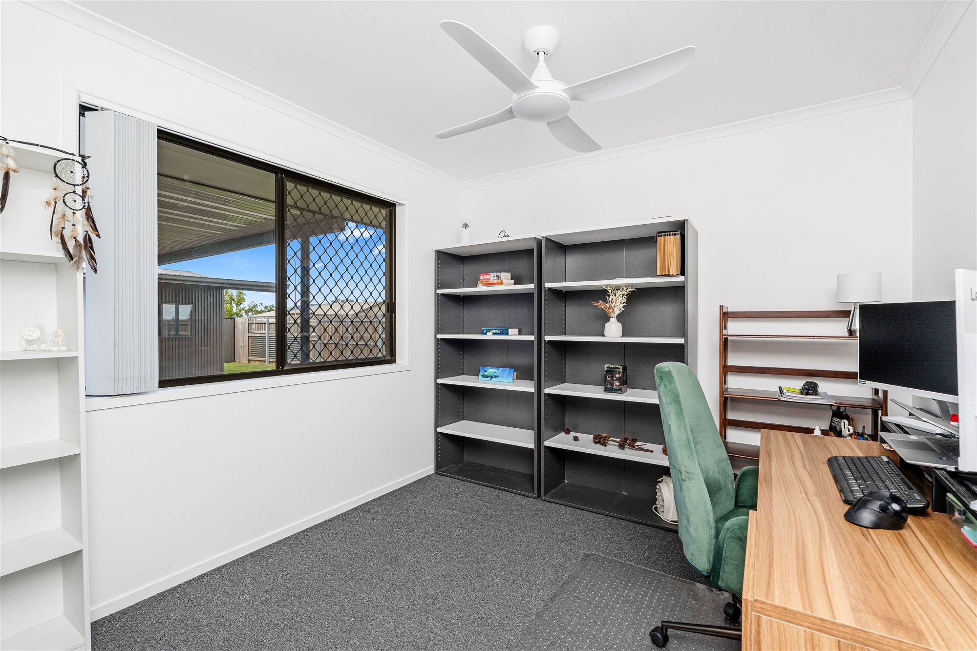 Security screens and ceiling fans throughout