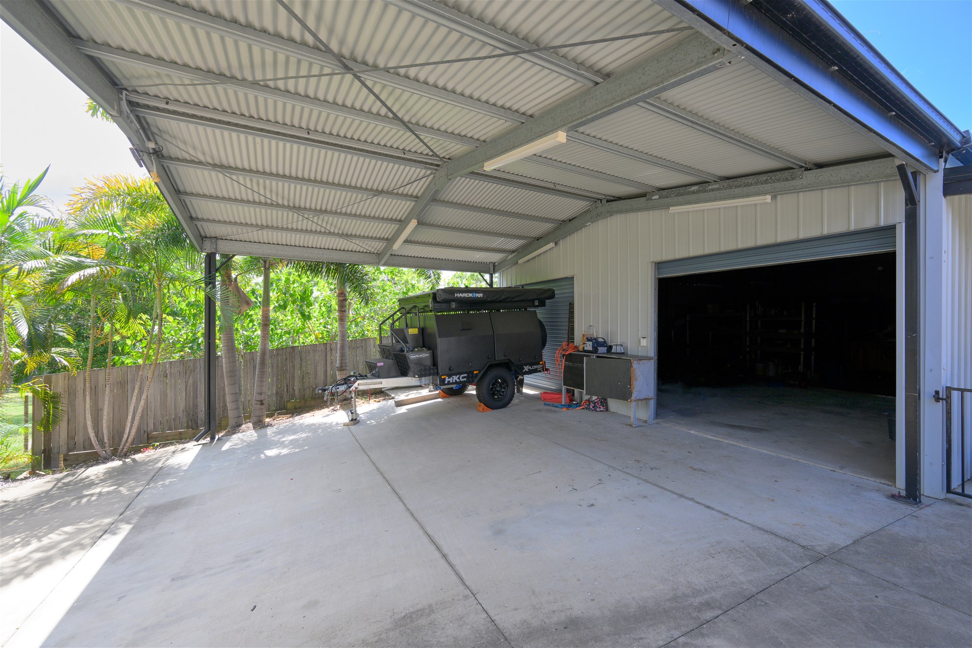 * Spacious 3-bay powered shed with front awning easily accommodates up to 5 vehicles