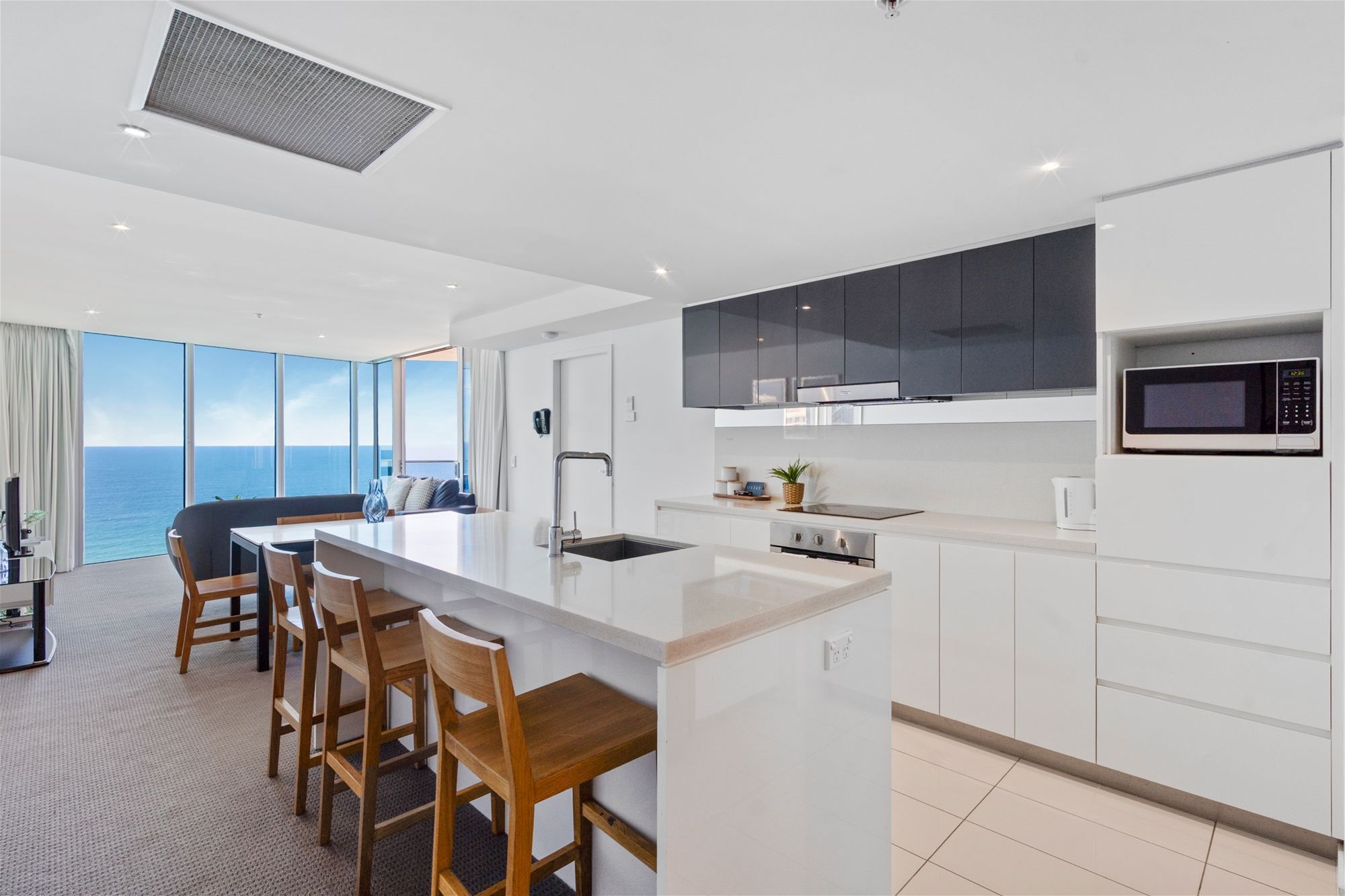 Floor-to-ceiling glazing fills the open-plan living and dining area with natural light while framing the expansive outlook. The gourmet kitchen is finished with stone benchtops and quality European appliances, designed to combine functionality with elegant simplicity while entertaining or preparing meals.