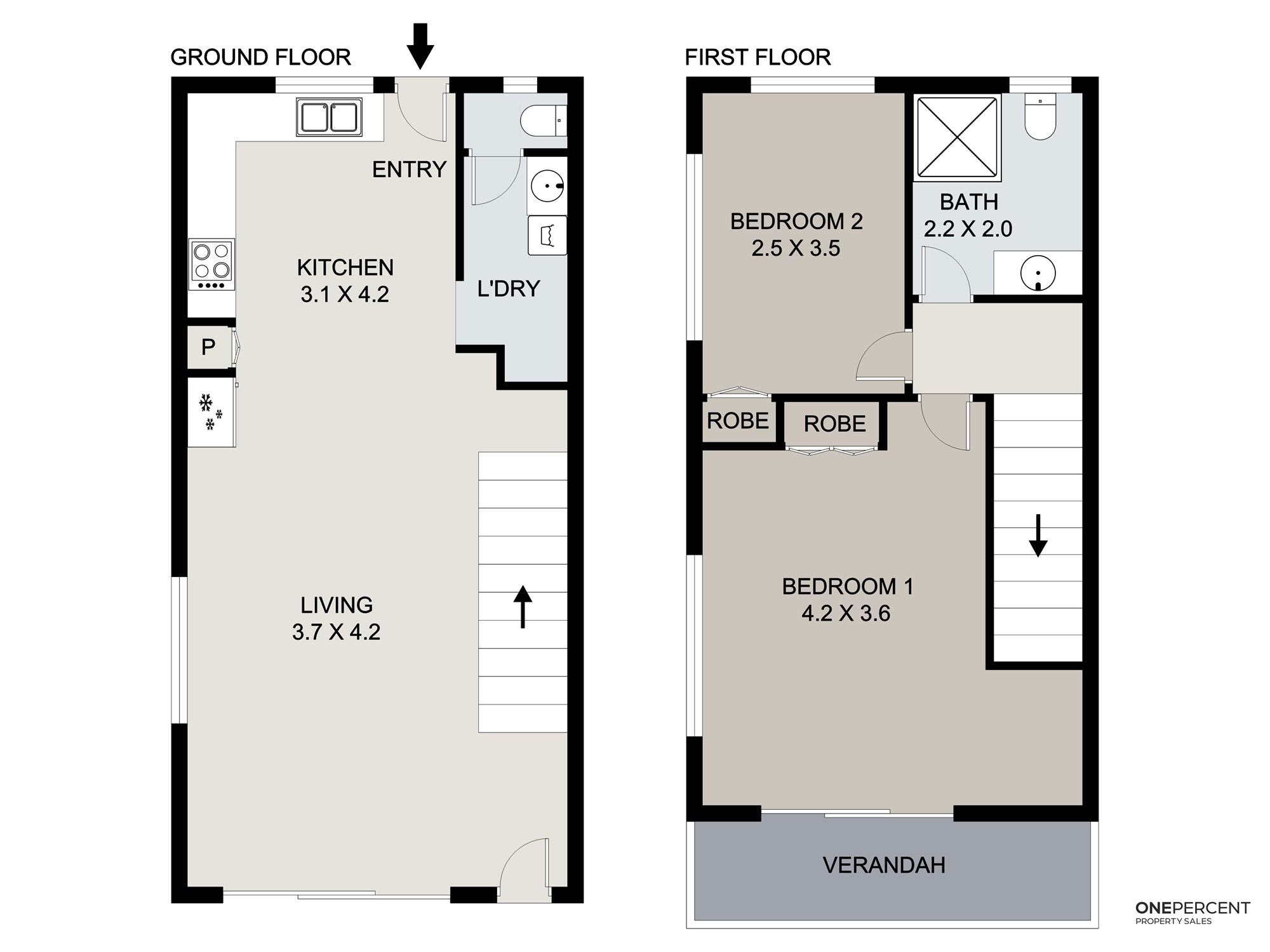 The ground level is designed for easy everyday living, with an open plan living, dining and kitchen area that feels light, airy and welcoming, enhanced by the home’s generous proportions. The modern kitchen features crisp cabinetry, quality appliances and a stylish tiled splashback, flowing effortlessly through to the dining space and out to the private courtyard. A wide, modernised staircase provides a striking and practical transition to the upper level. Upstairs, both bedrooms are generously proportioned, complemented by a functional bathroom and a covered balcony that adds an extra layer of privacy and lifestyle appeal.