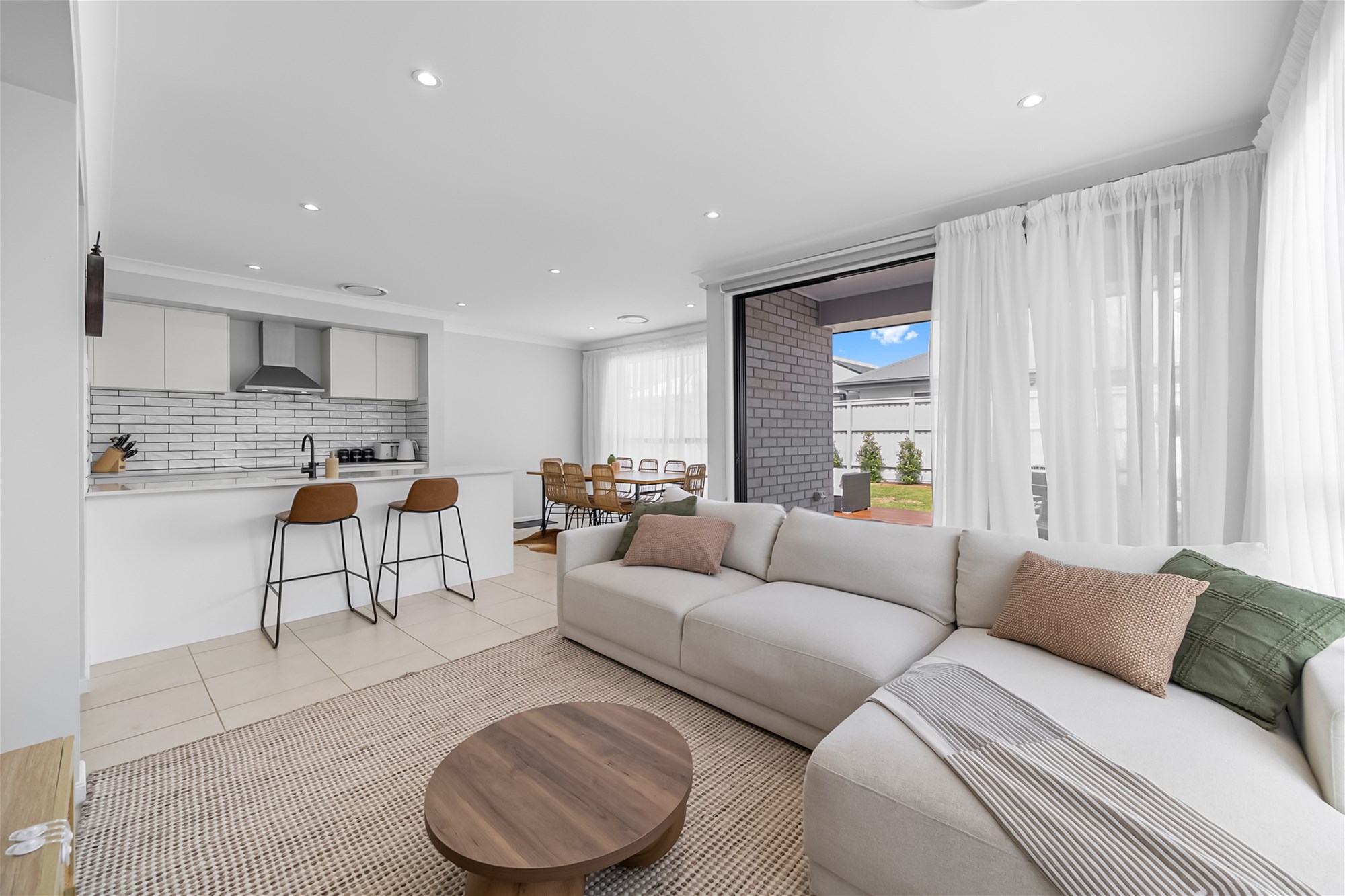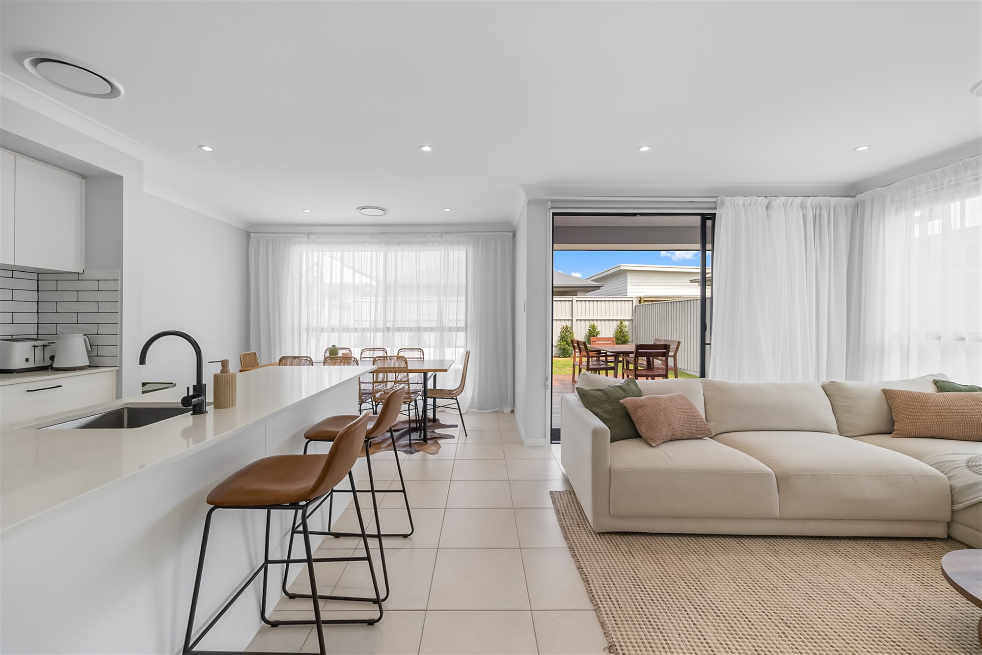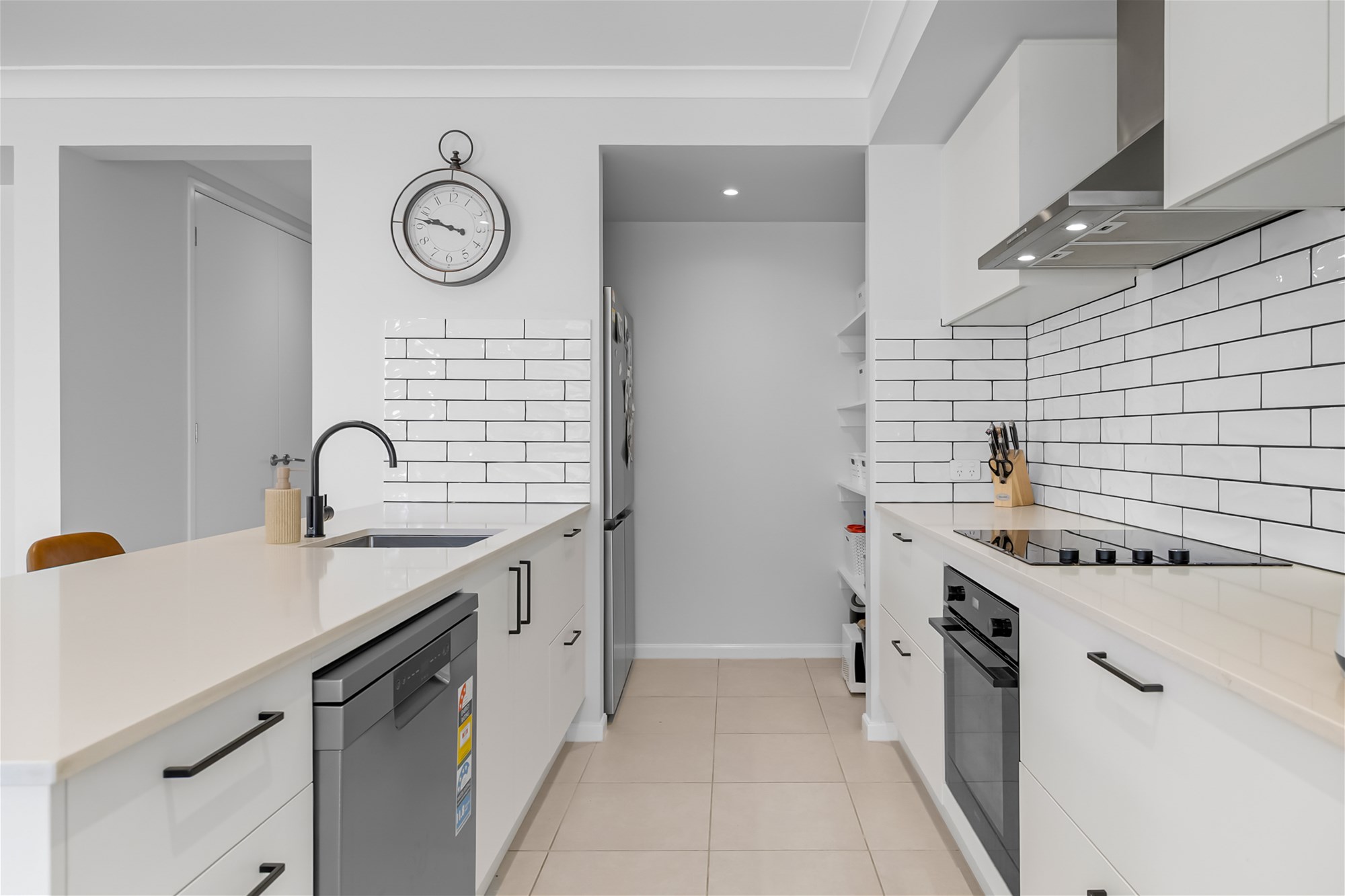 Inside, light-filled open-plan living flows seamlessly through wide sliding doors to the covered alfresco and deck, creating the perfect indoor–outdoor lifestyle. The stylish galley kitchen features stone benchtops, subway tile splashback, matte black finishes, a generous island bench and walk-in pantry — combining everyday functionality with modern design.