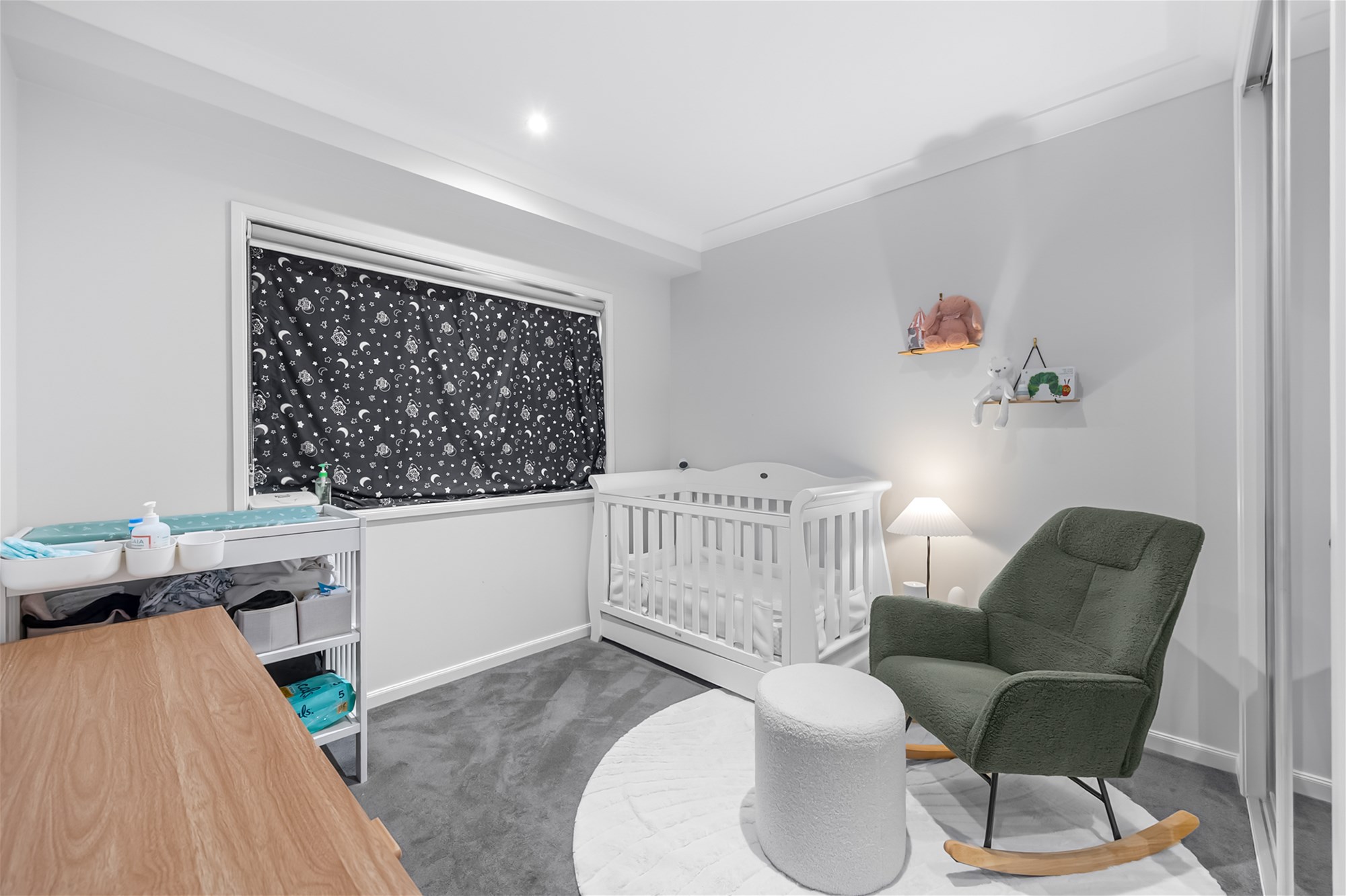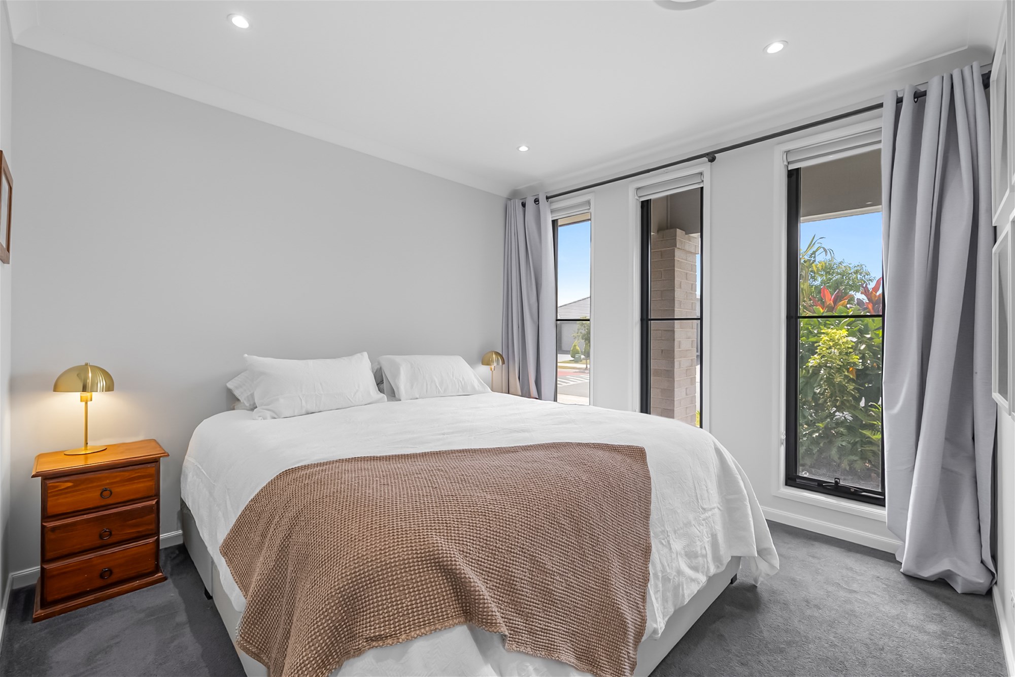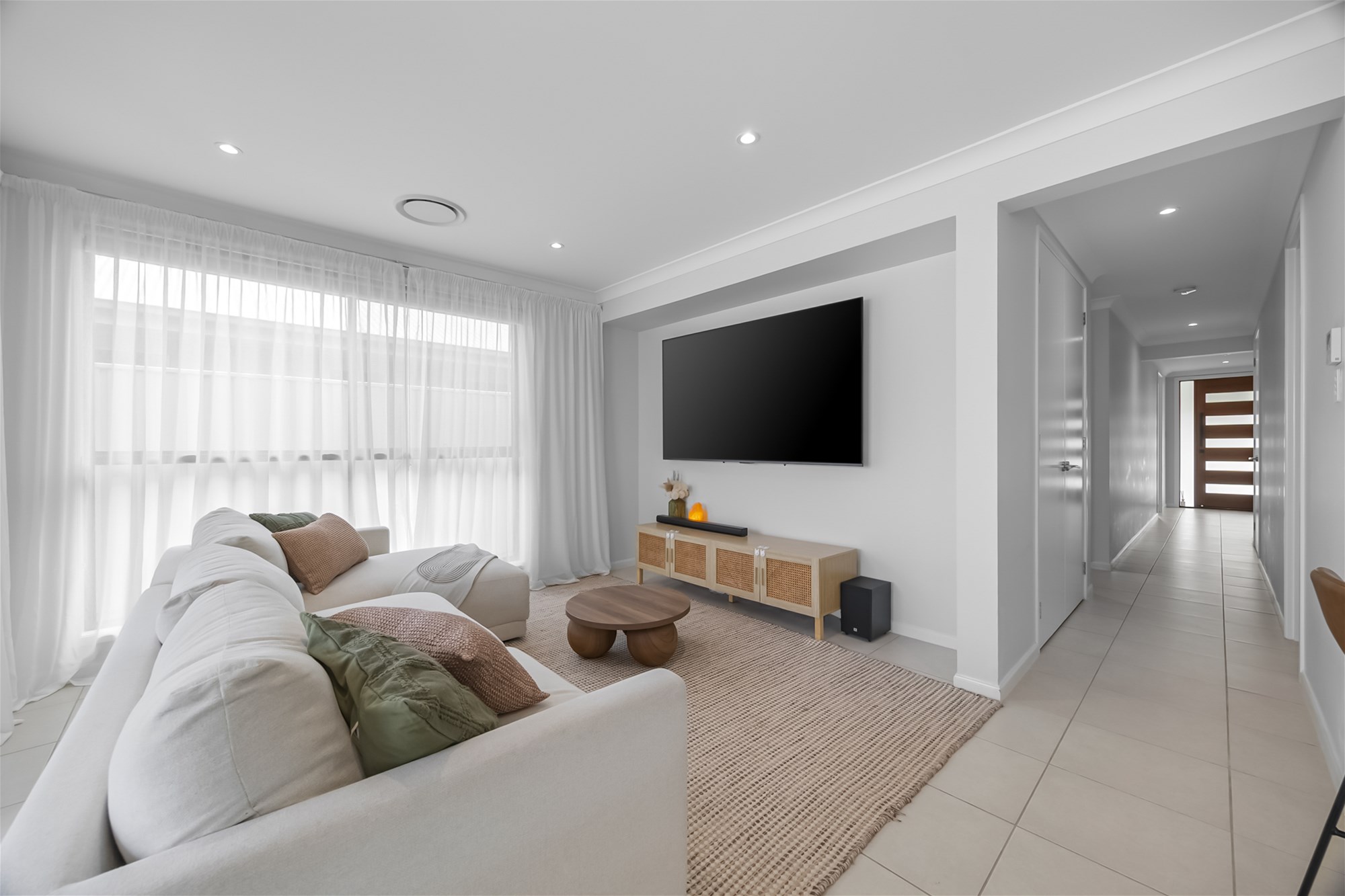 Inside, light-filled open-plan living flows seamlessly through wide sliding doors to the covered alfresco and deck, creating the perfect indoor–outdoor lifestyle. The stylish galley kitchen features stone benchtops, subway tile splashback, matte black finishes, a generous island bench and walk-in pantry — combining everyday functionality with modern design.
