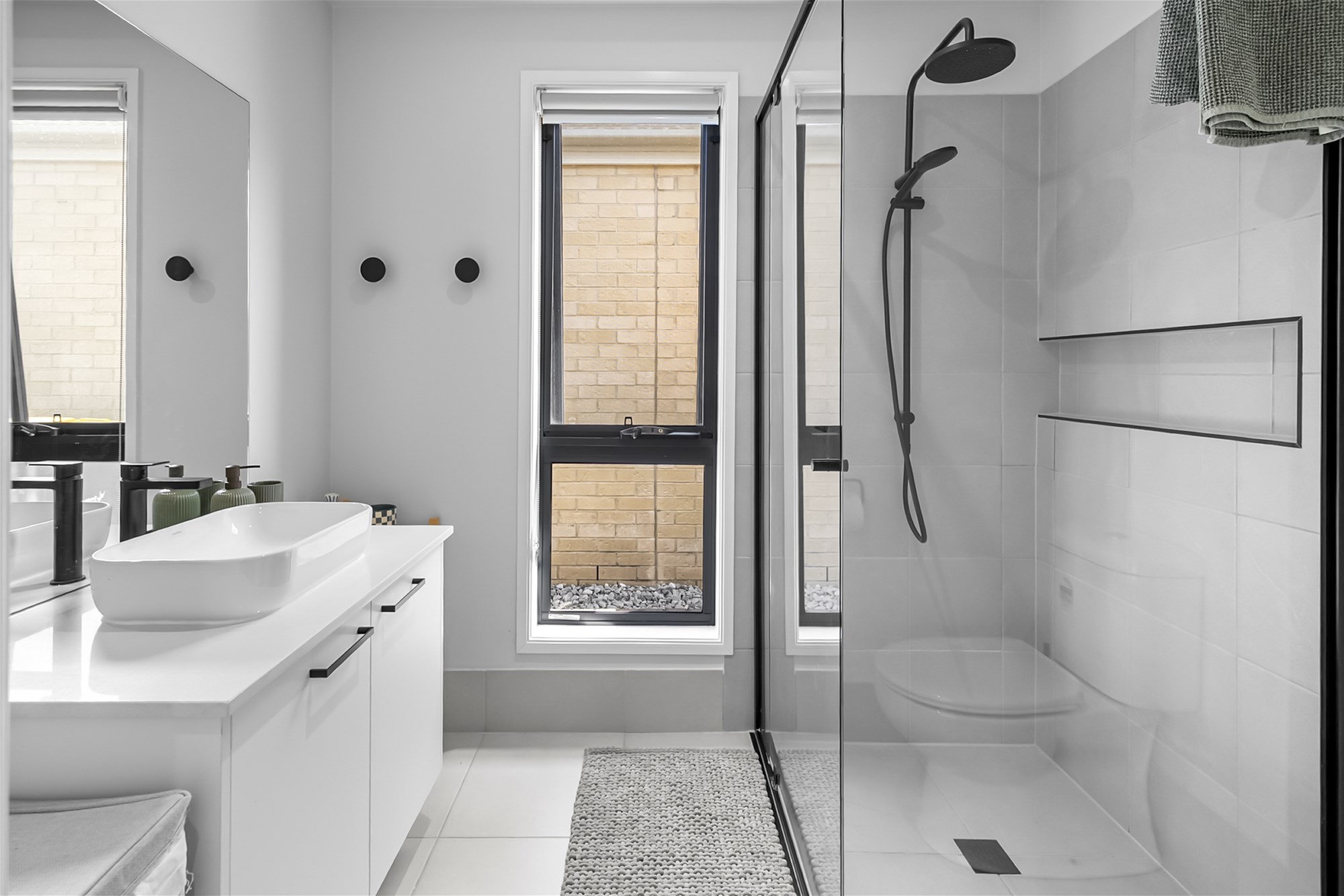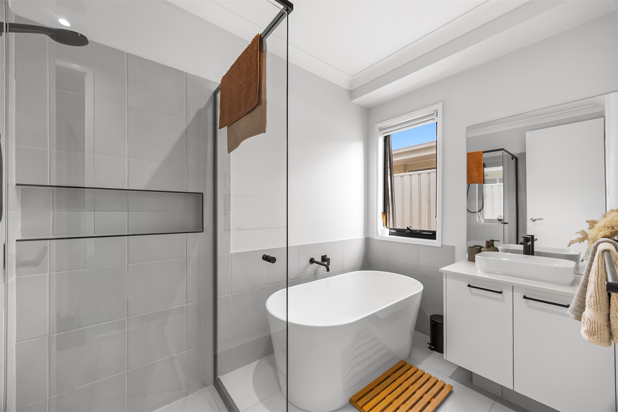 A true standout is the luxurious open-plan bathroom design, showcasing a freestanding bath positioned within the shower zone, floor-to-ceiling tiling, frameless glass screen and sleek floating vanity — a bold and contemporary statement.