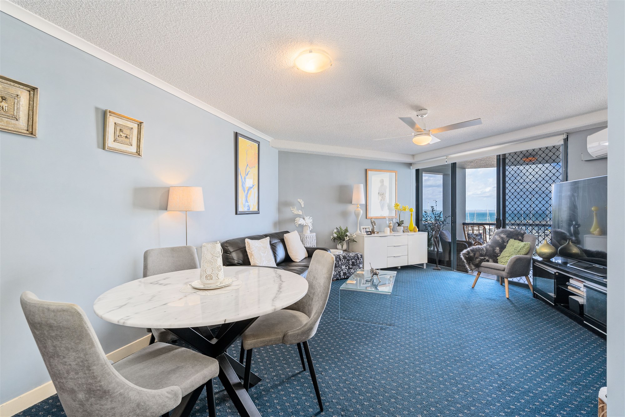 Light-filled open-plan living and dining, with air conditioning, opening to a private balcony