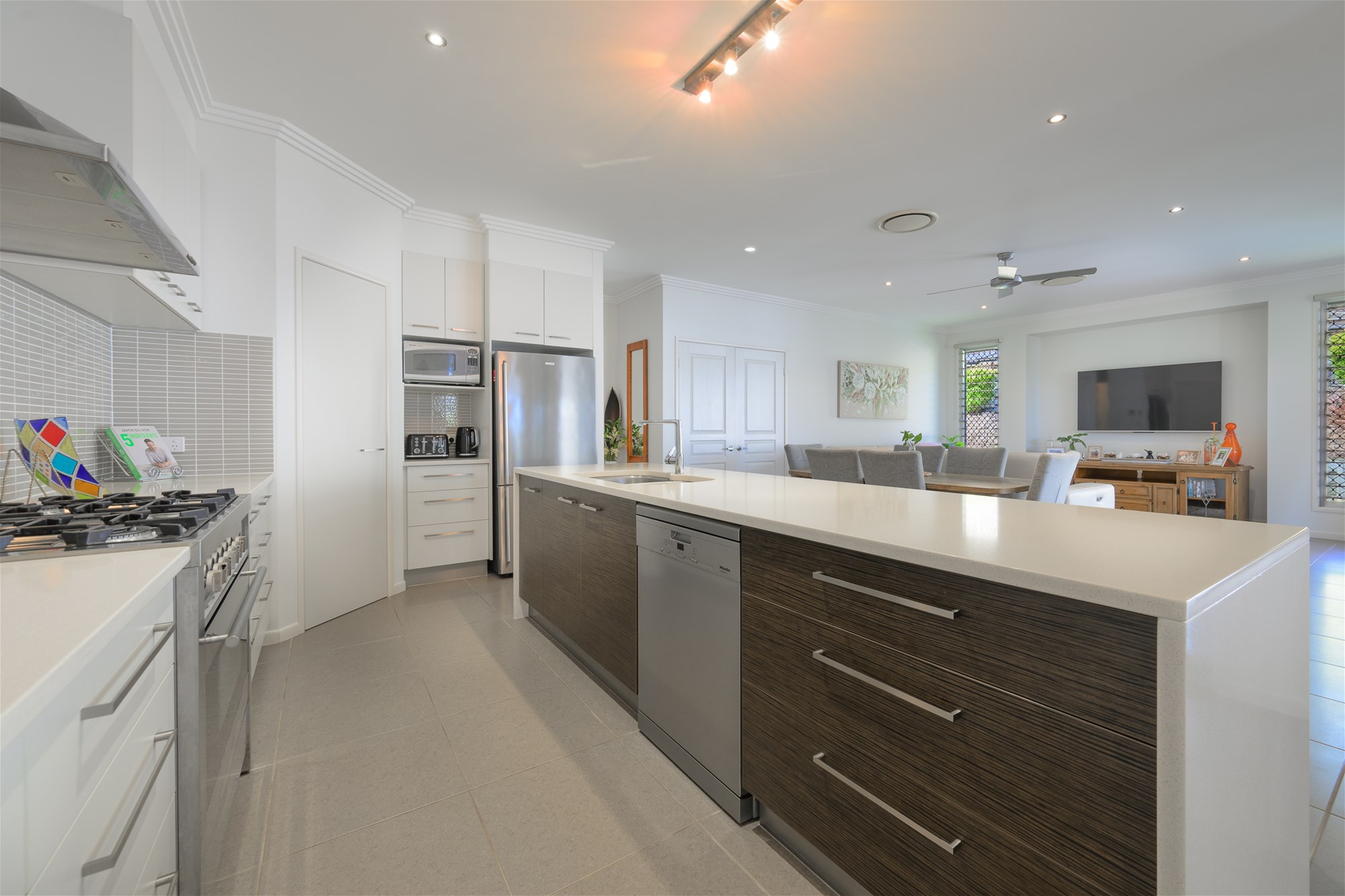 The heart of the home is the expansive open plan living and dining area, seamlessly connecting to a superbly appointed kitchen. Featuring a gas cooktop, oversized stainless steel electric oven, and a walk-in pantry, this space has been designed to cater to both everyday living and hosting with ease. A large island bench provides the perfect central gathering point, while ducted air conditioning throughout ensures year-round comfort.